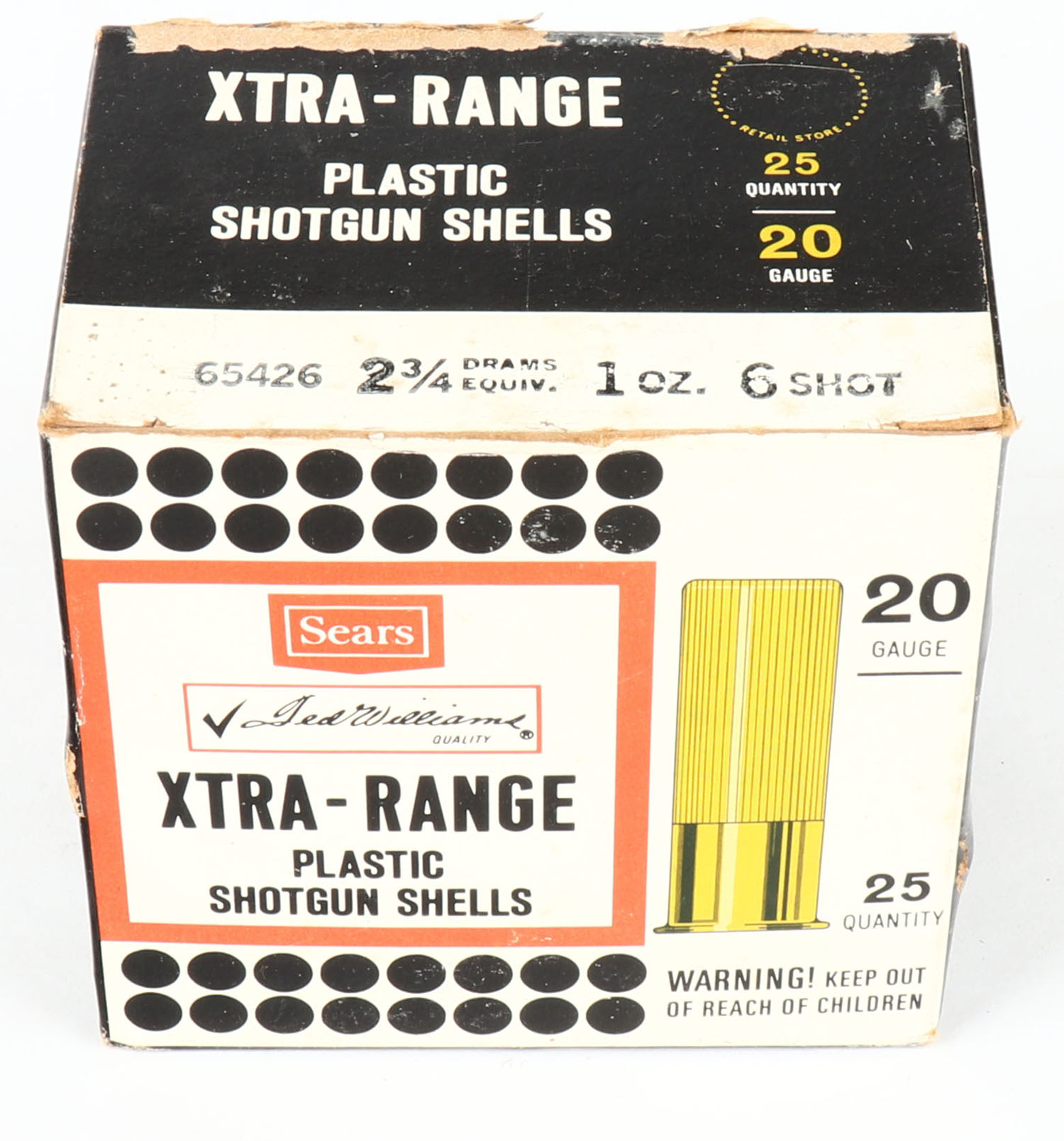Sears, Xtra-Range, 20ga., 1pc., Full, shot size 6, multi-colored box, box is solid, plastic shells are excellent. Grade: Very Good - Value: 10 to 40