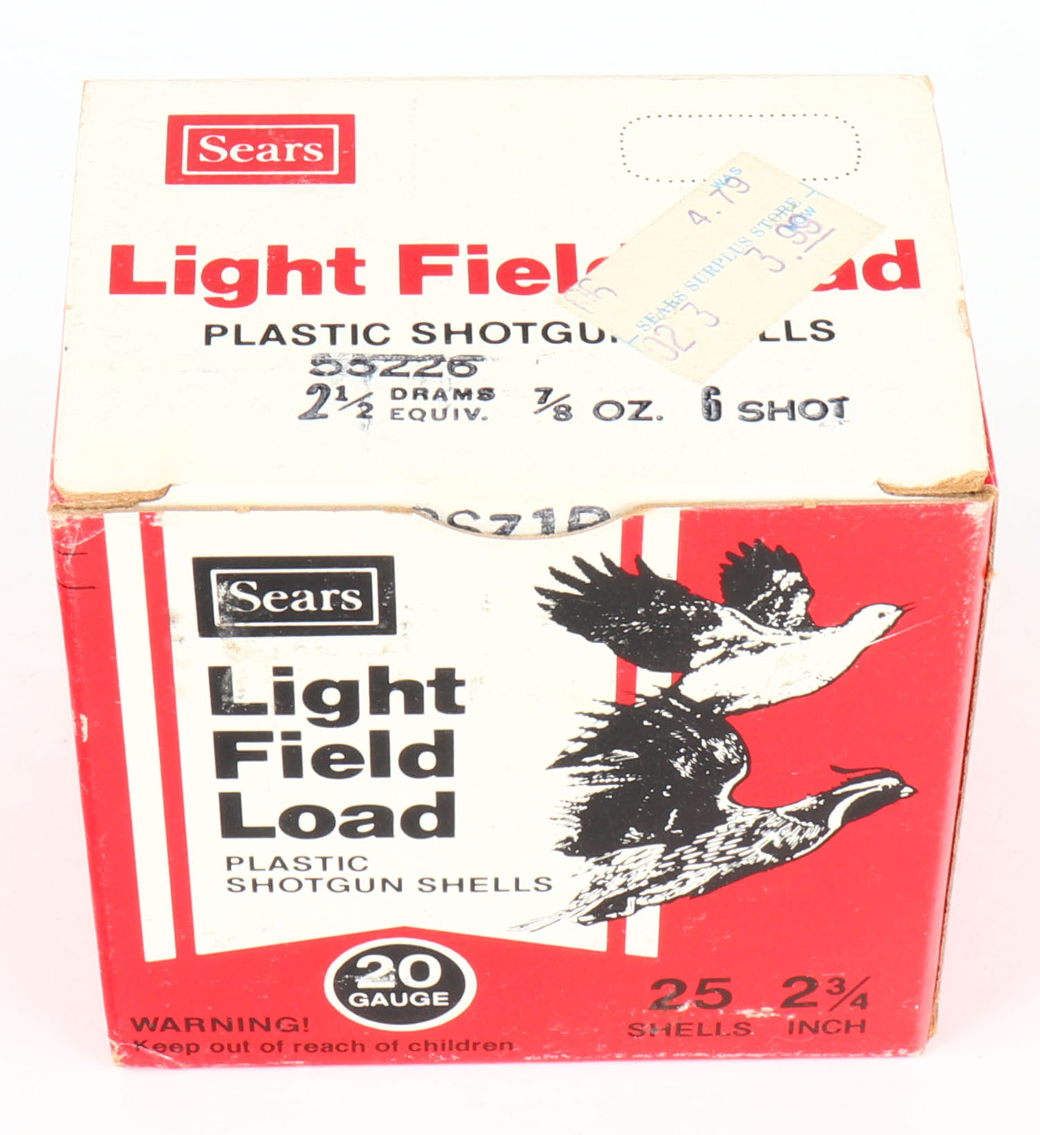 Sears, Light Field Load, 20ga., 1pc., 2 3/4'', shot size 6, multi-color box, box is very solid, plastic shells are excellent. Grade: Excellent - Value: 10 to 40
