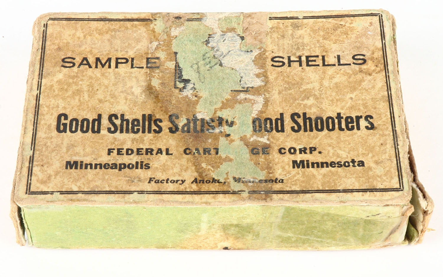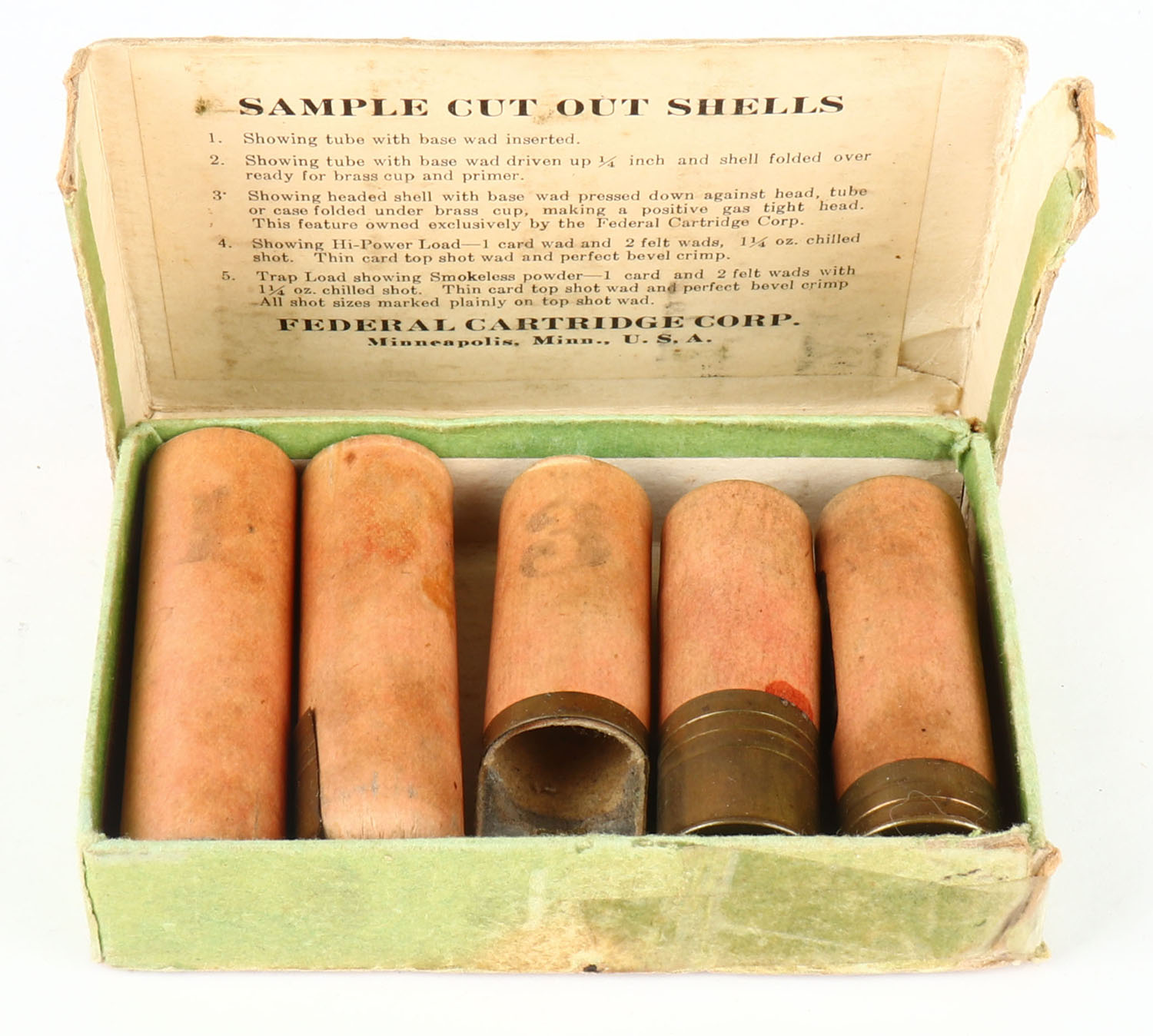 Federal, Hi-Power 5pc. Salesman sample set in green box , ''SAMPLE SHELLS'' on front with flying mallard logo, shows 5 steps of shotshell loading, Full Set, 2pc., box has age soiling & scuffing with a partial seam split, the five shells are very good. Grade: Good + - Value: 50 to 200