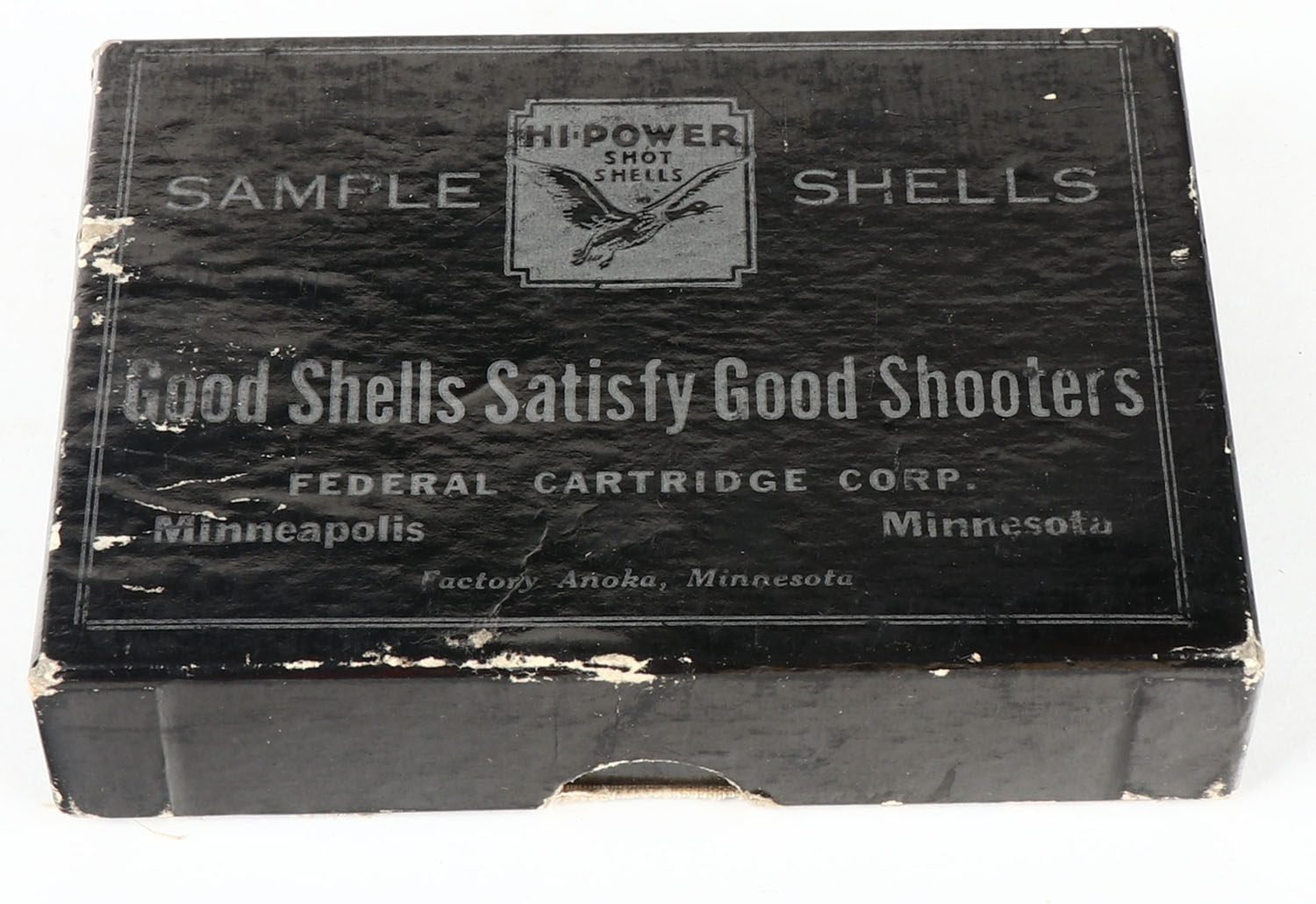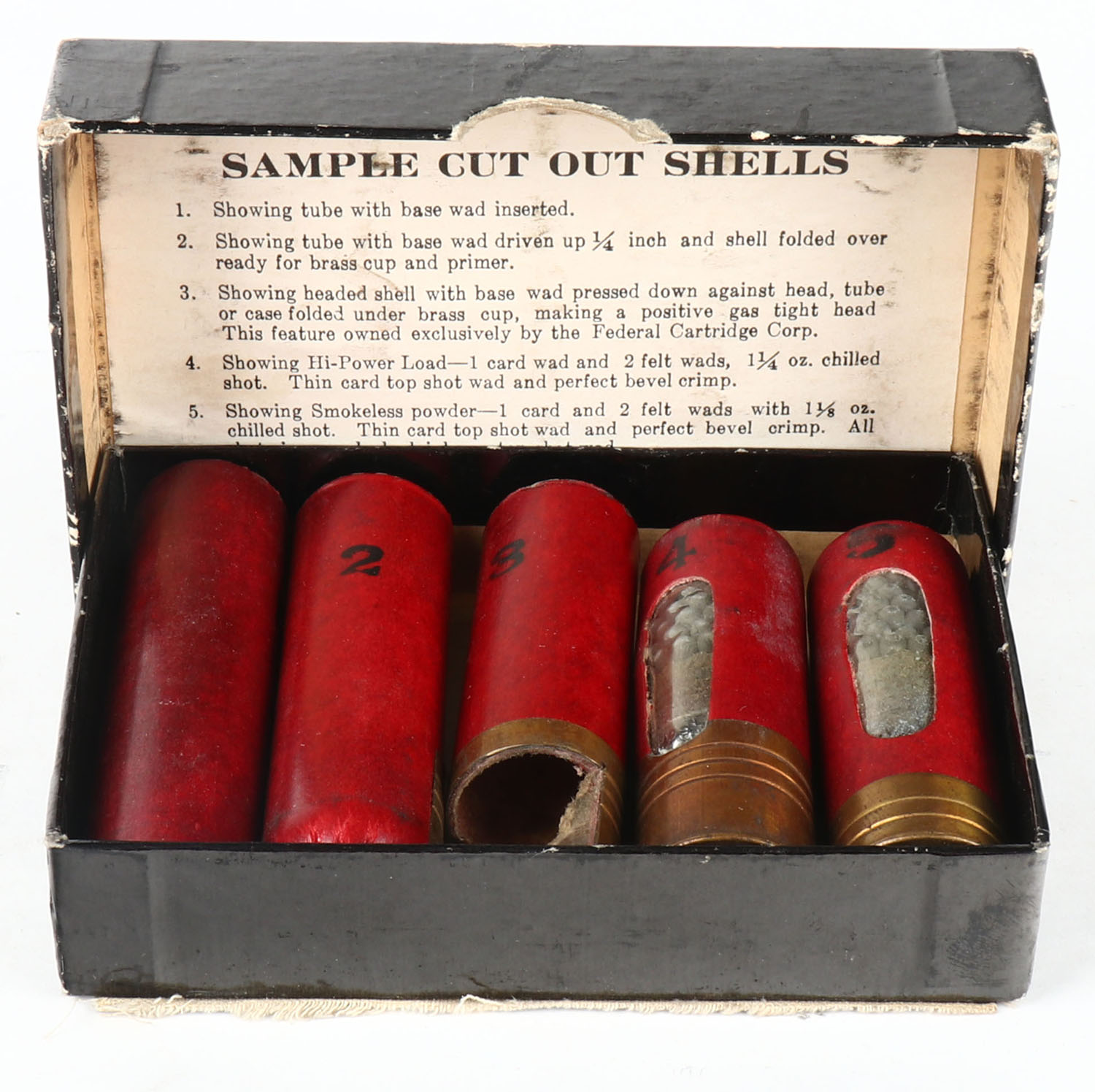 Federal, Hi-Power 5 pc salesman sample set in Black box, 2pc., ''SAMPLE SHELLS'' on front with flying mallard logo, shows 5 steps of shotshell loading, box is very solid with some edge wear, the five shells are excellent. Grade: Excellent + - Value: 100 to 300