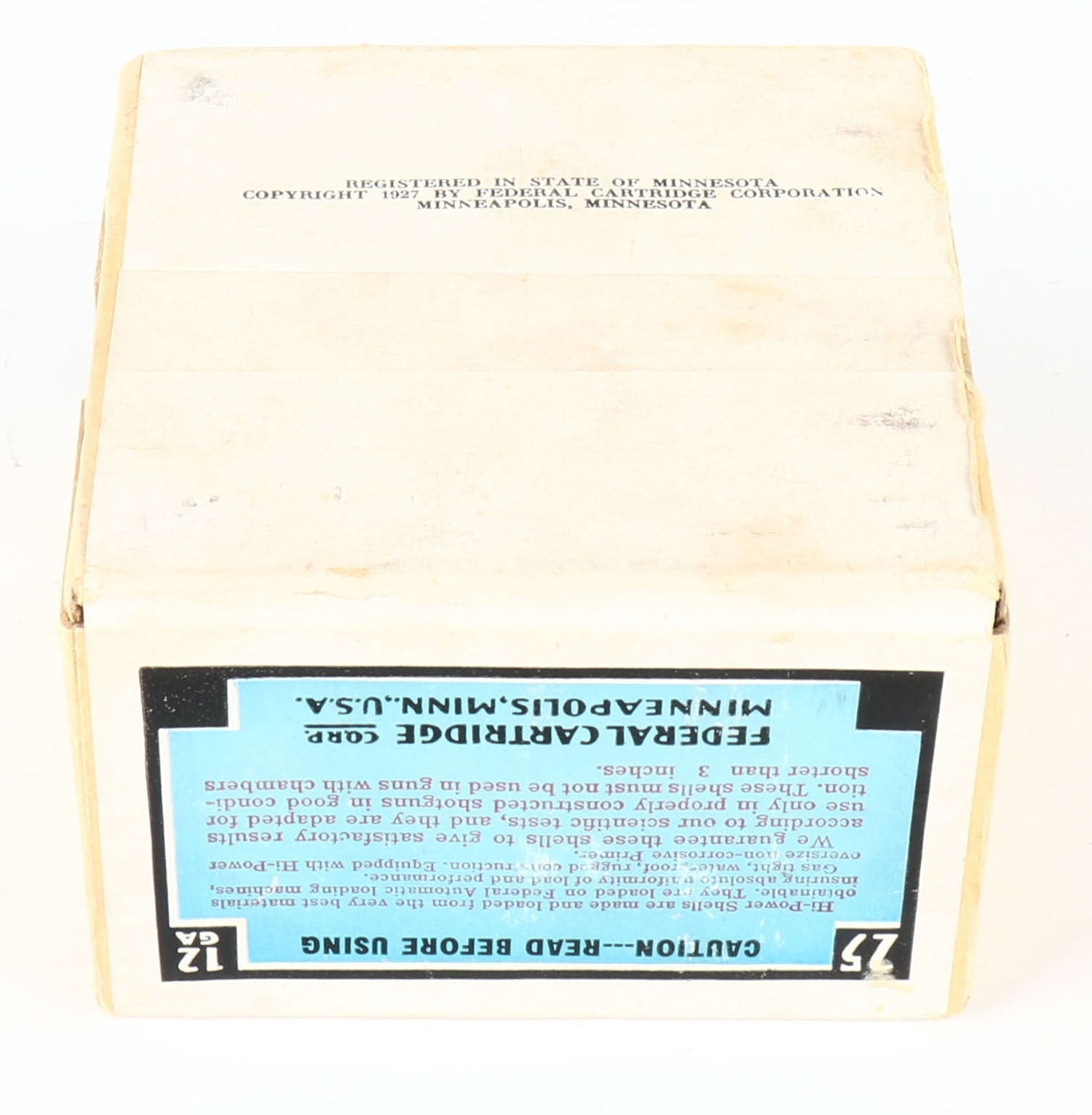 Federal Cart. Co., HI-POWER, 12ga., 2 PIECE!, FULL & SEALED, Loading: Magnum 3''- 1 5/8- 6CH Shot, buff box with multi colored label that pictures Mallard in flight, box is very solid with very nice label. Grade: Excellent + - Value: 100 to 300