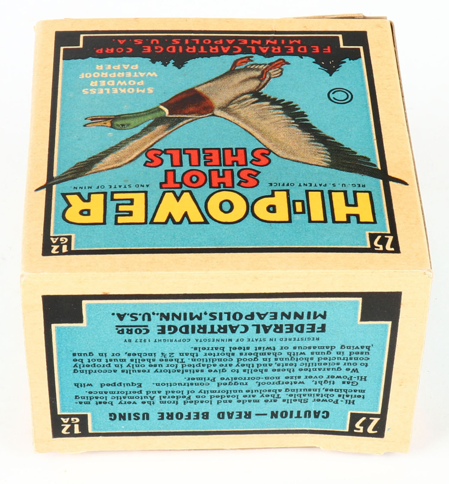 Federal Cart. Co., HI-POWER, 12ga., 1pc., Empty, shot size unknown, Black border, blue, yellow and red box with flying mallard, box is very solid with minty colors. Grade: MINT - Value: 10 to 60