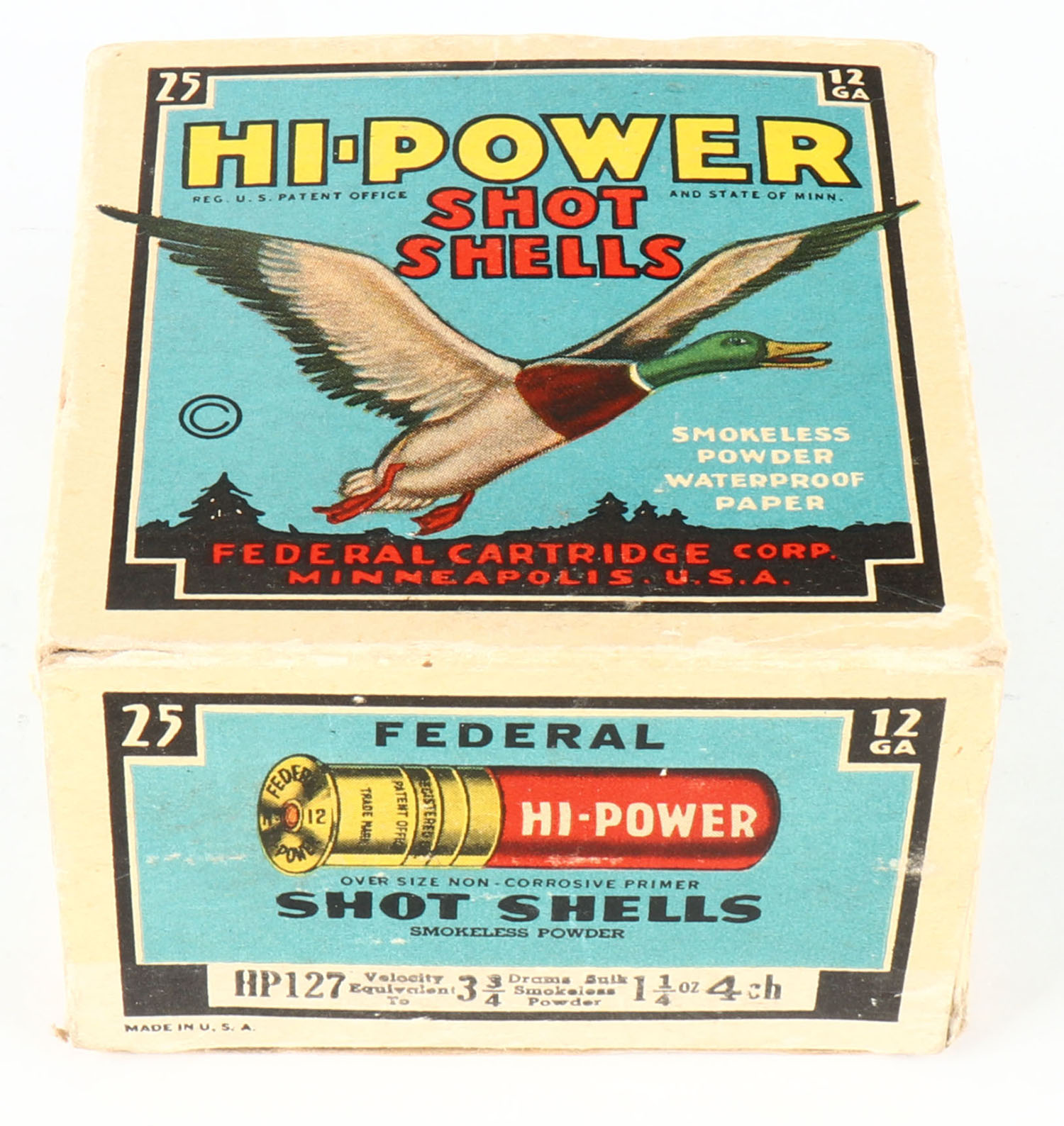 Federal Cart. Co., HI-POWER, 12ga., 1pc., Empty, shot size 4CH, Black border, blue, yellow and red box with flying mallard, box is very solid with excellent colors. Grade: Excellent - Value: 10 to 40