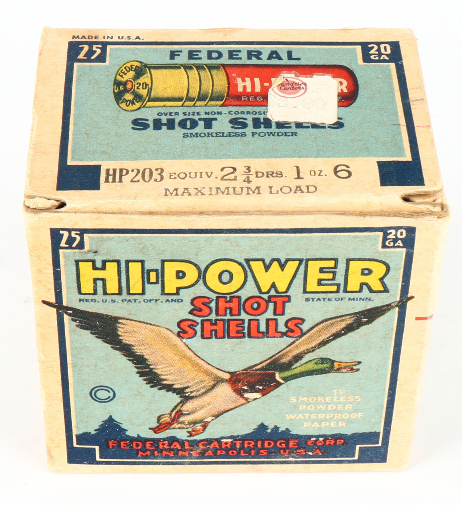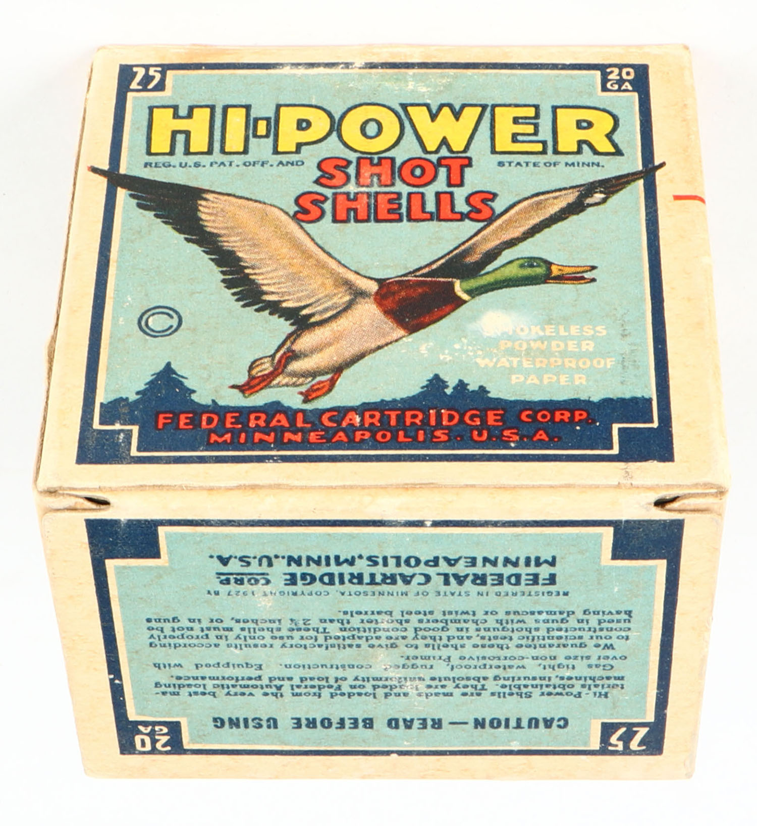 Federal Cart. Co., HI-POWER, 20ga., 1pc., Full, shot size 6, Blue border, blue, yellow and red box with flying mallard, box has minor age soiling with very nice colors, paper shells are excellent. Grade: Very Good ++ - Value: 10 to 40