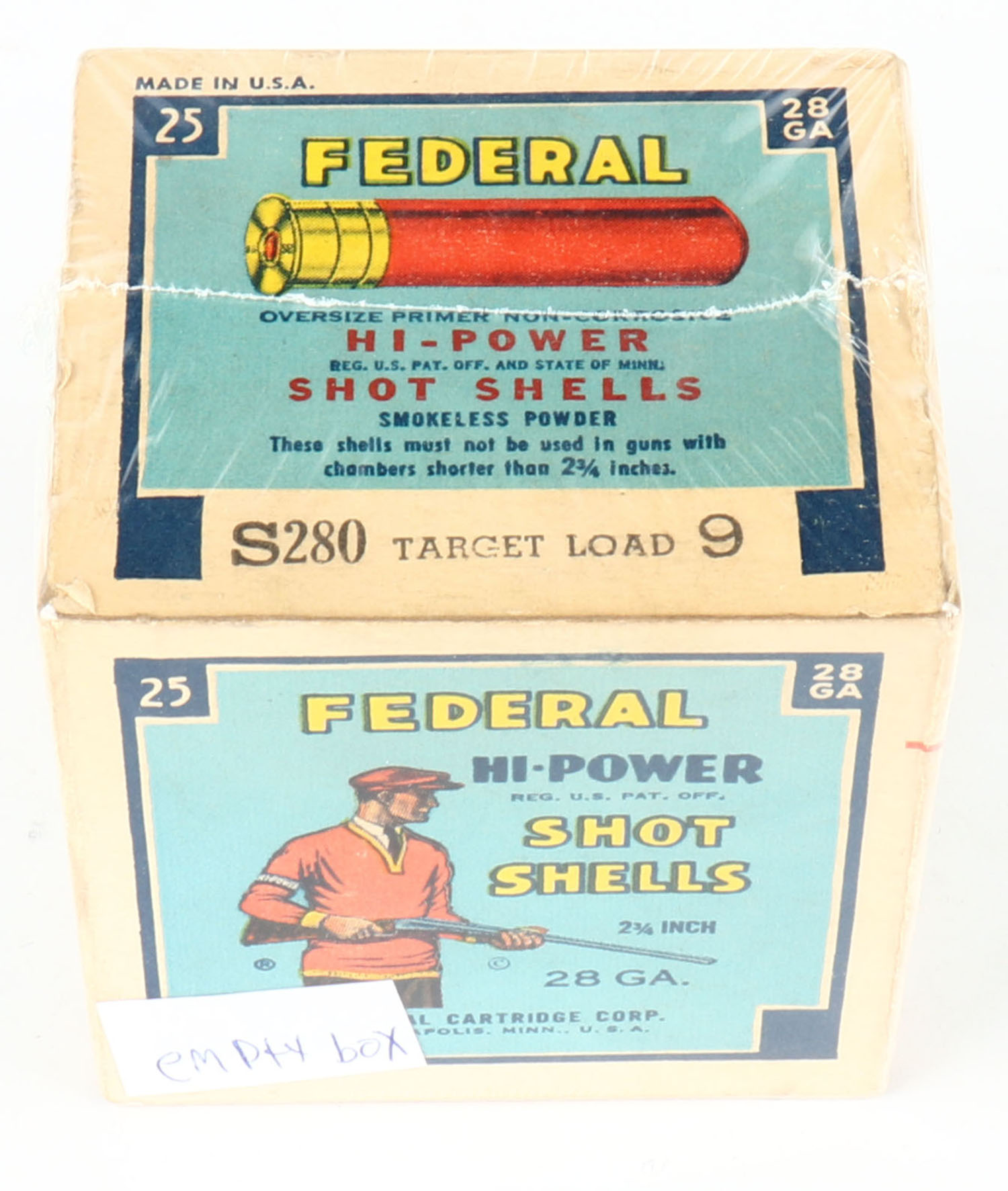 Federal Cart. Co., HI-POWER, 28ga., 1pc., Empty, shot size 9 Target Load, Blue border, blue, yellow and red box with trap shooter, box is very solid with excellent color. Grade: MINT - Value: 20 to 80