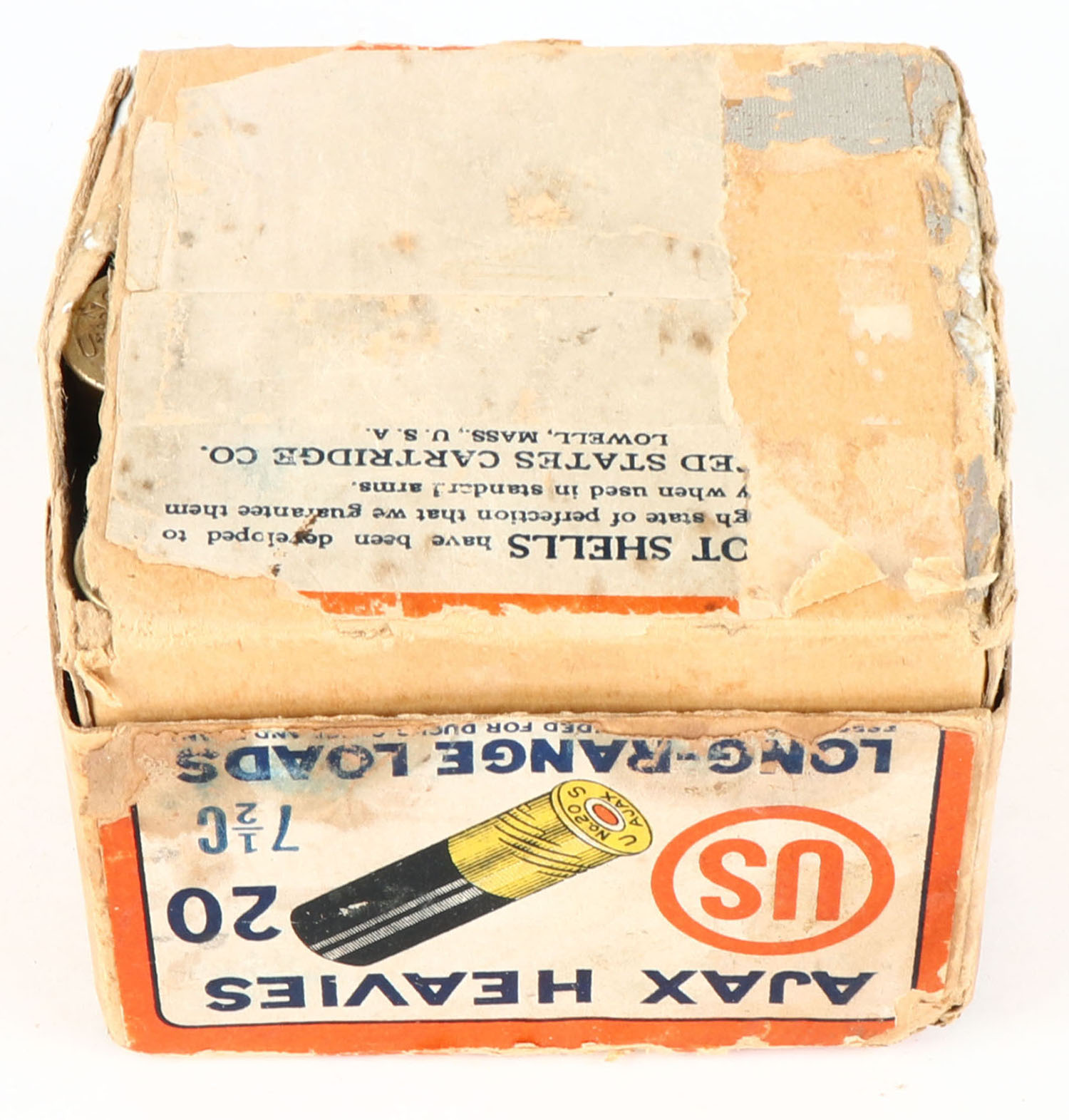 U.S. Cart. Co., Lowell, Mass., AJAX HEAVIES, 20ga., 2pc., Full, shot size 7 1/2C, RARE in 2 1/2'', buff box with white, orange & blue paper label, box has age soiling & scuffing, has a partial tear to front with a tape repair to inside, paper shells are excellent. Grade: Good ++ - Value: 20 to 100