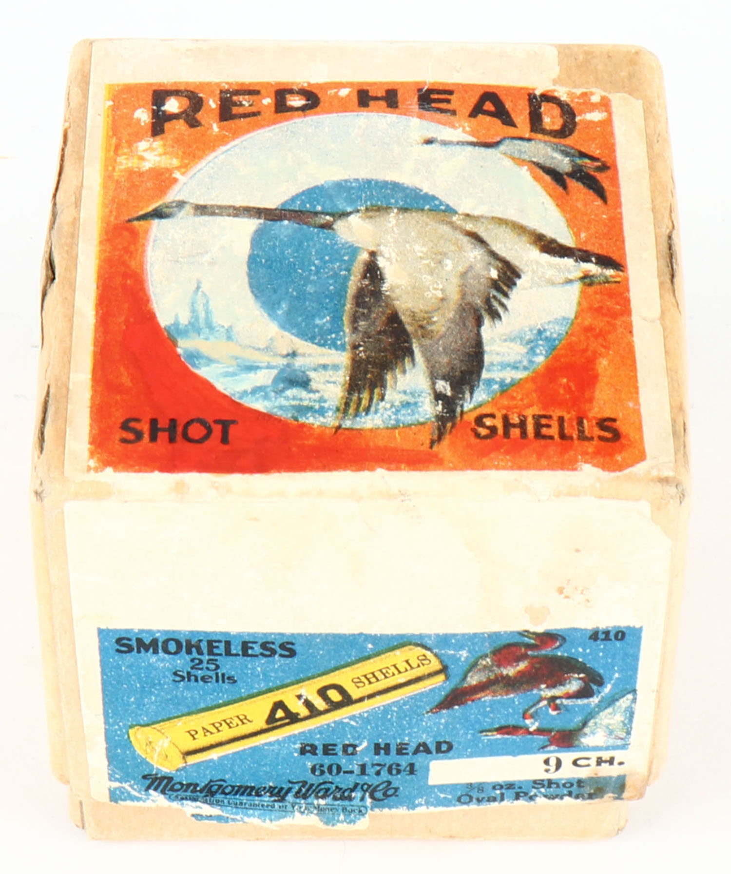 Montgomery Ward & Co., Red Head, 410ga., 2pc., Partial 16rds., 2 1/2'', shot size 9Ch., Paper Shells, buff box with multi-colored scene & two geese flying, label has been professionally restored, box has some age soiling with edge wear, paper shells are very good. Grade: Very Good ++ - Value: 100 to 500