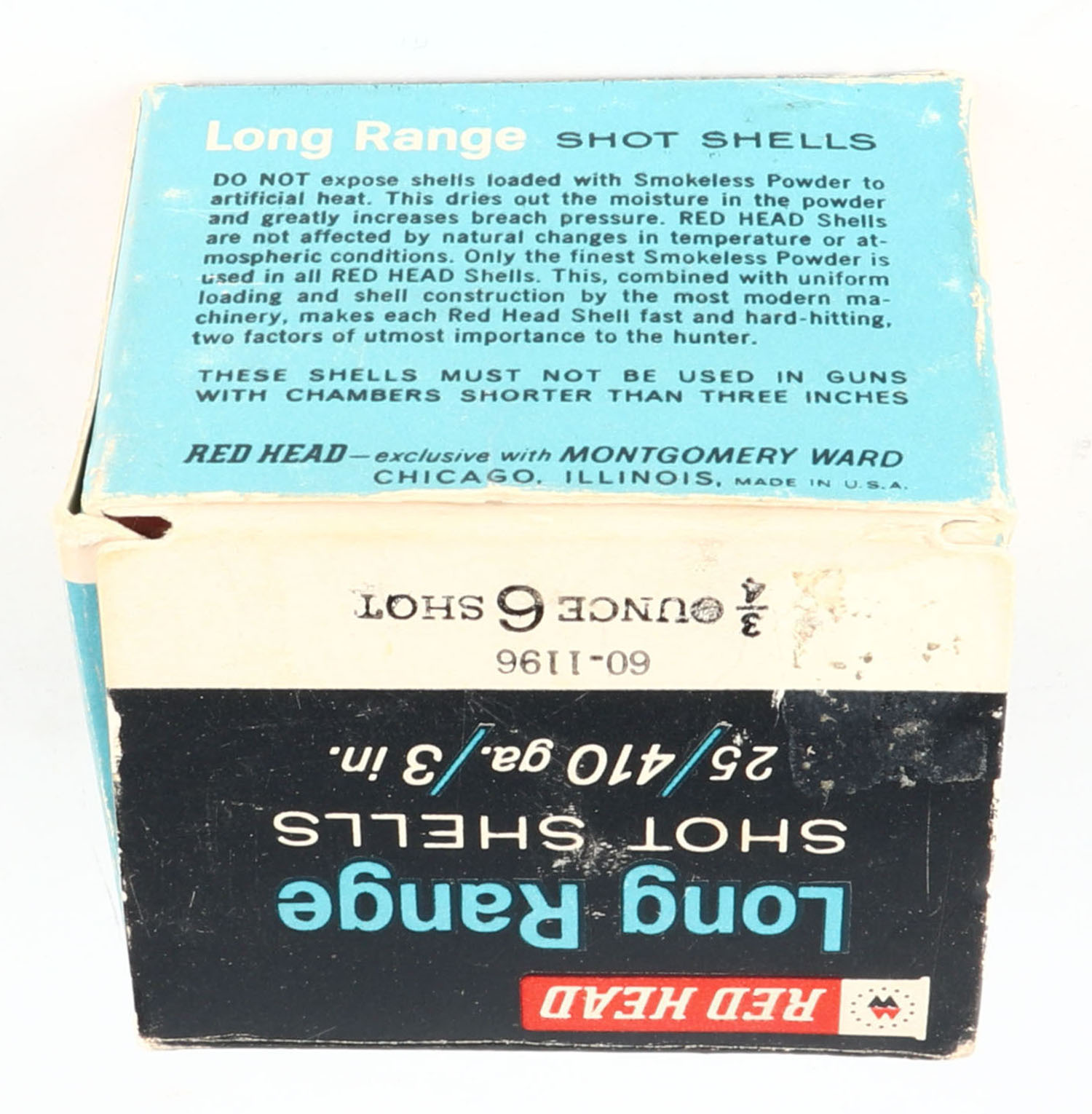 Wards Hawthorne, Long Range Shot Shells, 410ga., 3'', 1pc., Full of mixed shots, shot size 6, box has light scuffing with nice colors, paper shells are excellent. Grade: Very Good - Value: 10 to 30