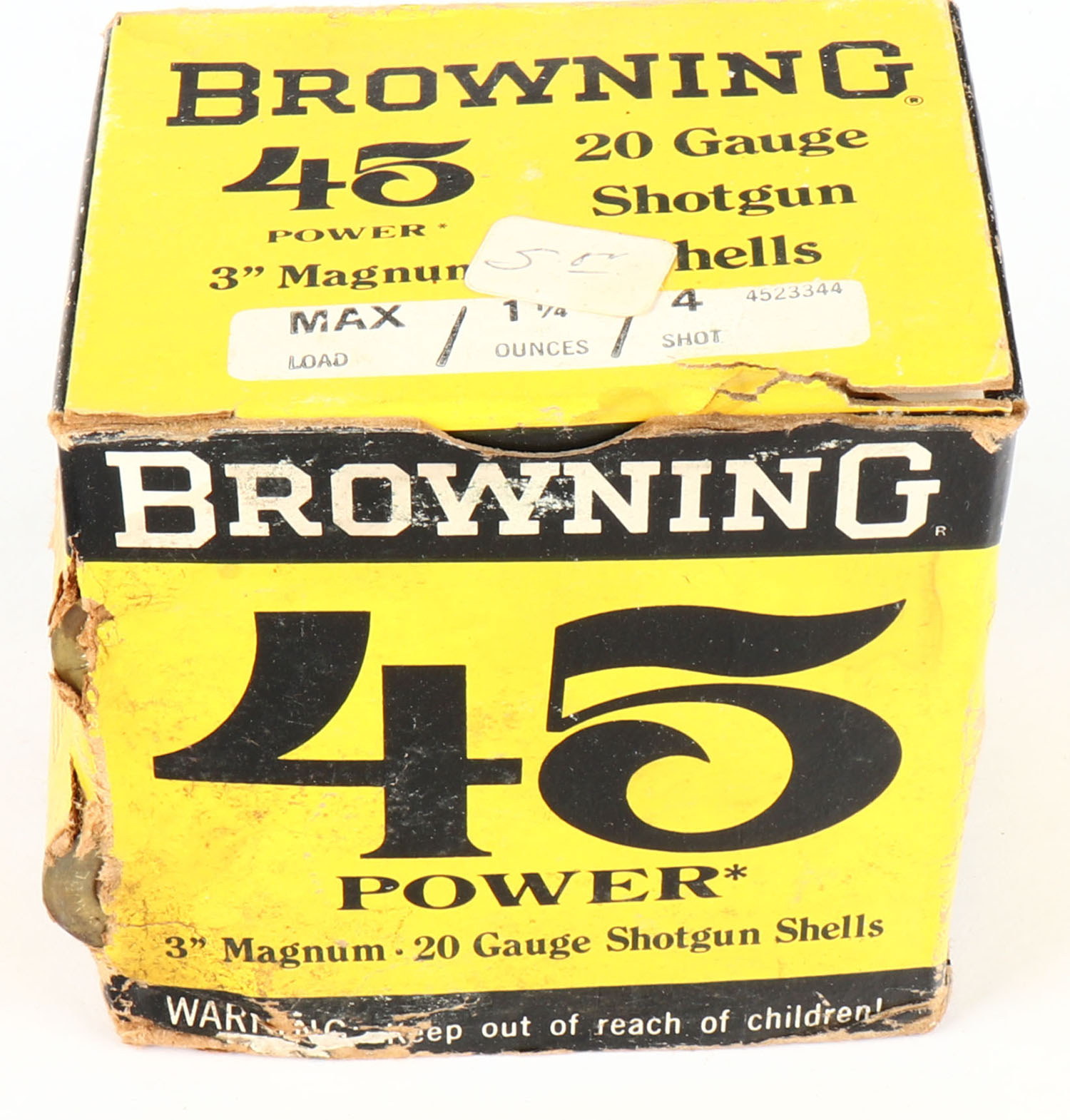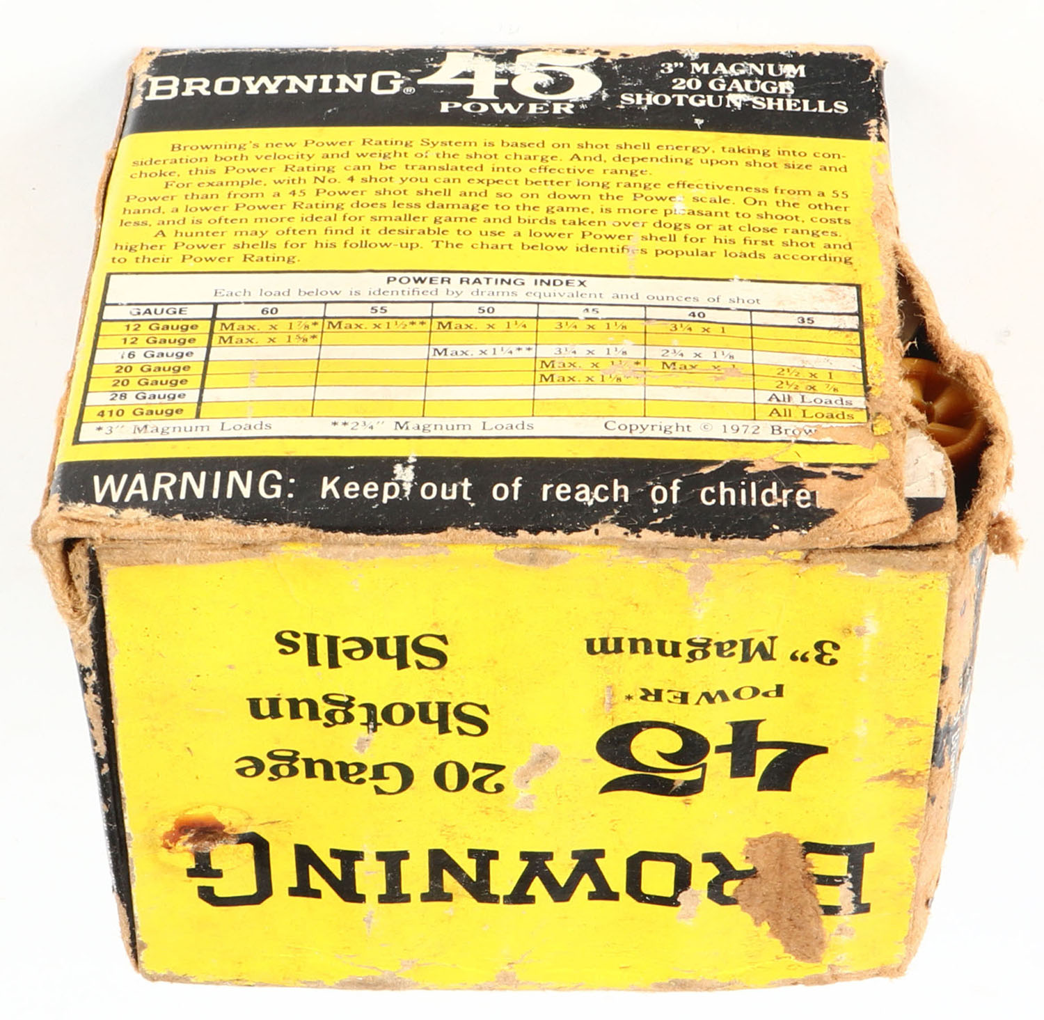 Browning, 45 Power, 20ga., 1pc., Full, shot size 4, 3'' Magnum, black, yellow & white box, box has age soiling & shell protrusion, plastic shells are good. Grade: Good - Value: 10 to 30