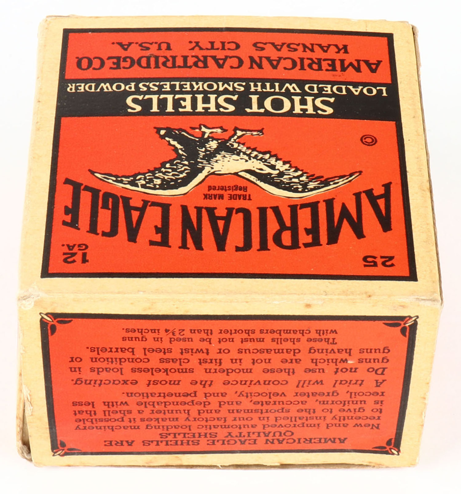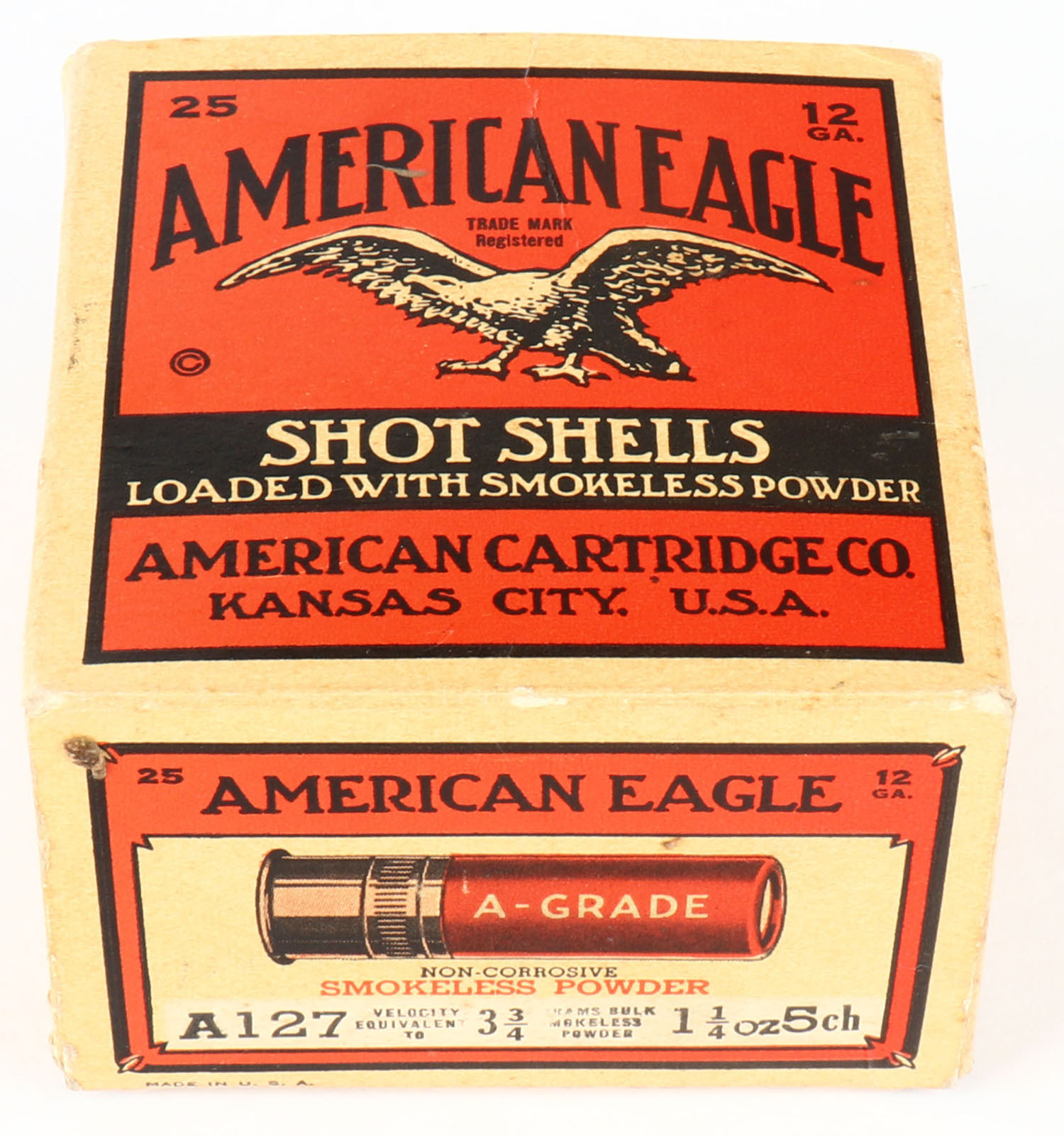 American Cart. Co., A-Grade, 12ga., 1pc., Empty, shot size 5ch, buff, red & black box that pictures a flying eagle, box is very solid with excellent color, has very minor edge wear. Grade: Excellent - Value: 20 to 80