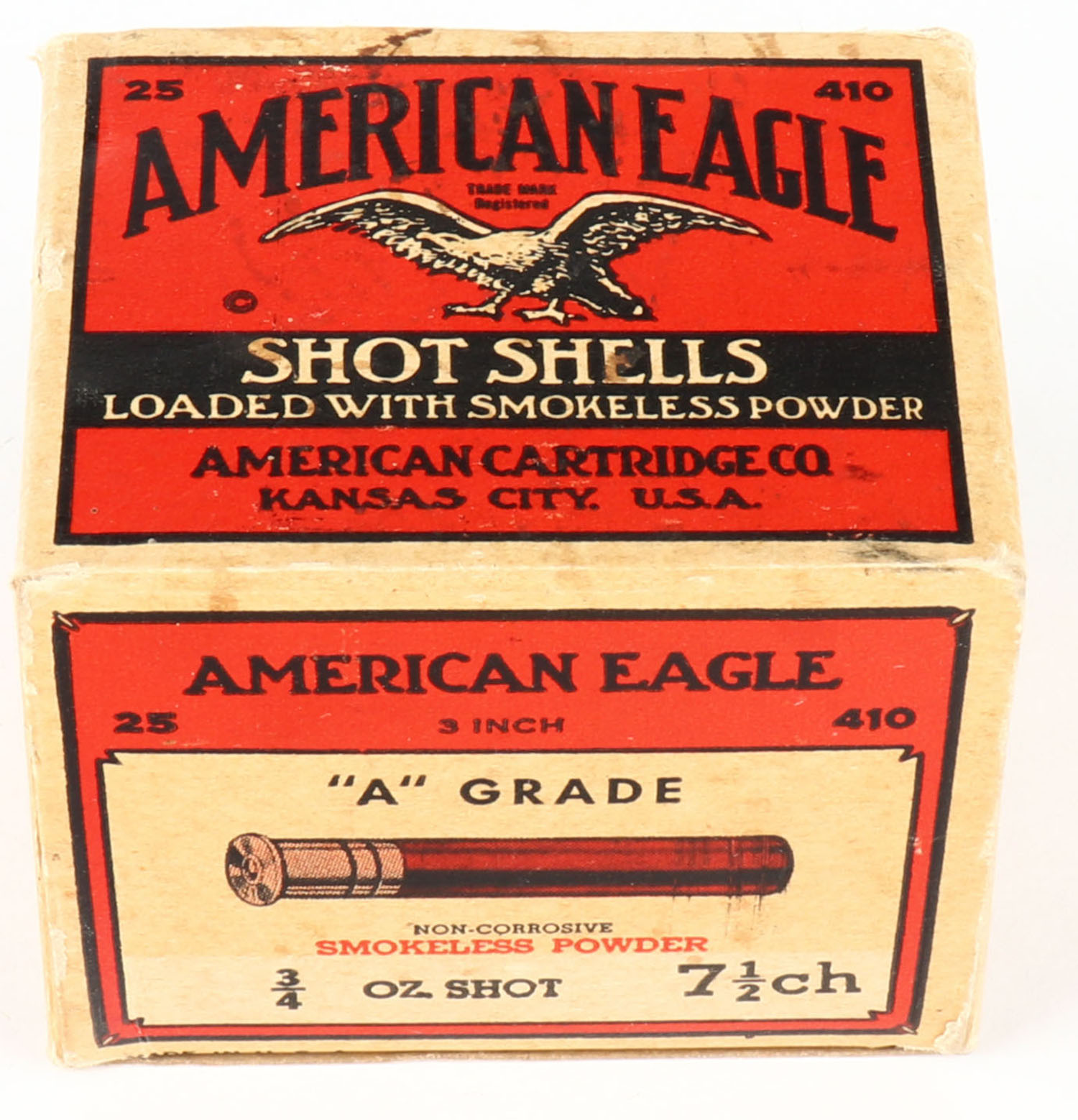 American Cart., Co., ''A'' Grade, 410ga., With Insert, 1pc., Partial 24rds., shot size 7 1/2ch, buff, red & black box that pictures a flying eagle, box is very solid with excellent colors, paper shells are excellent. Grade: Excellent + - Value: 40 to 200