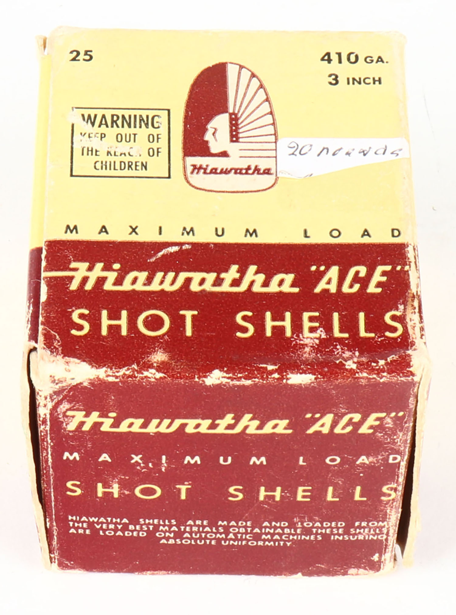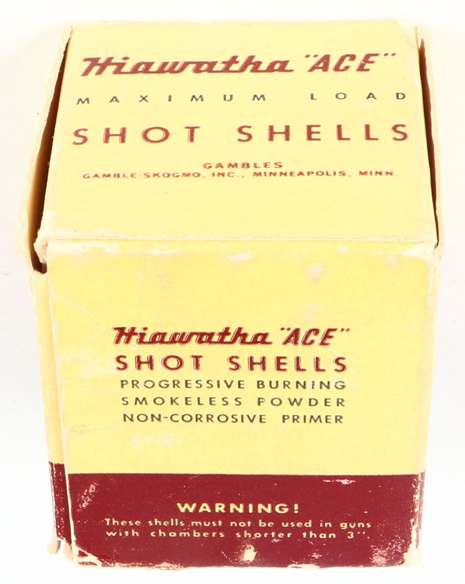 Gambles, Hiawatha ACE, 410ga., 1pc., Full, shot size 7 1/2, yellow, maroon & white box, box has age soiling & edge wear, paper shells are excellent. Grade: Very Good - Value: 30 to 100