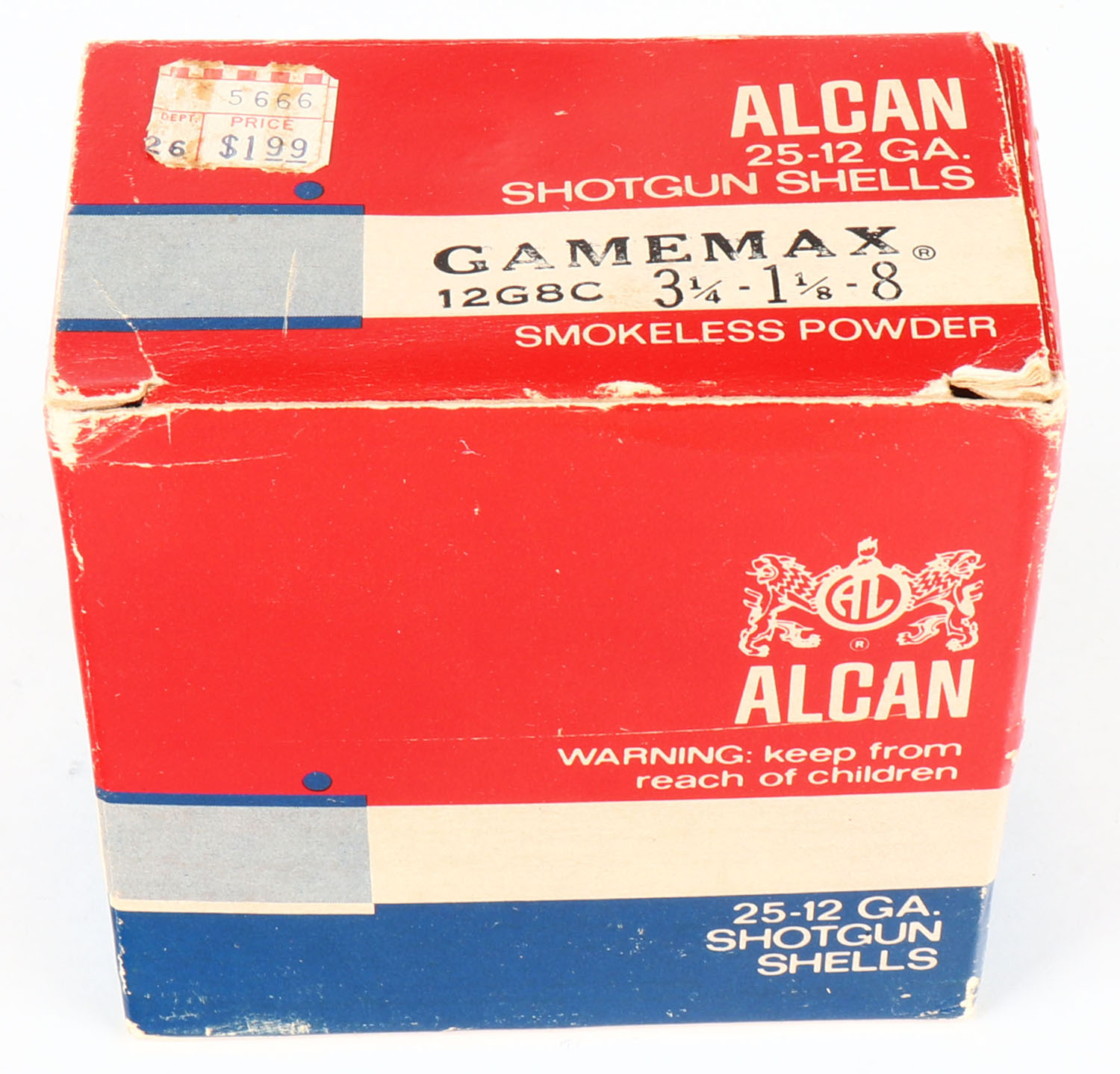 Alcan, Gamemax Smokeless Powder, 12ga., 1pc., Full, shot size 8, multi-colored box, box has some age soiling & edge wear, plastic shells are very good. Grade: Very Good - Value: 10 to 40
