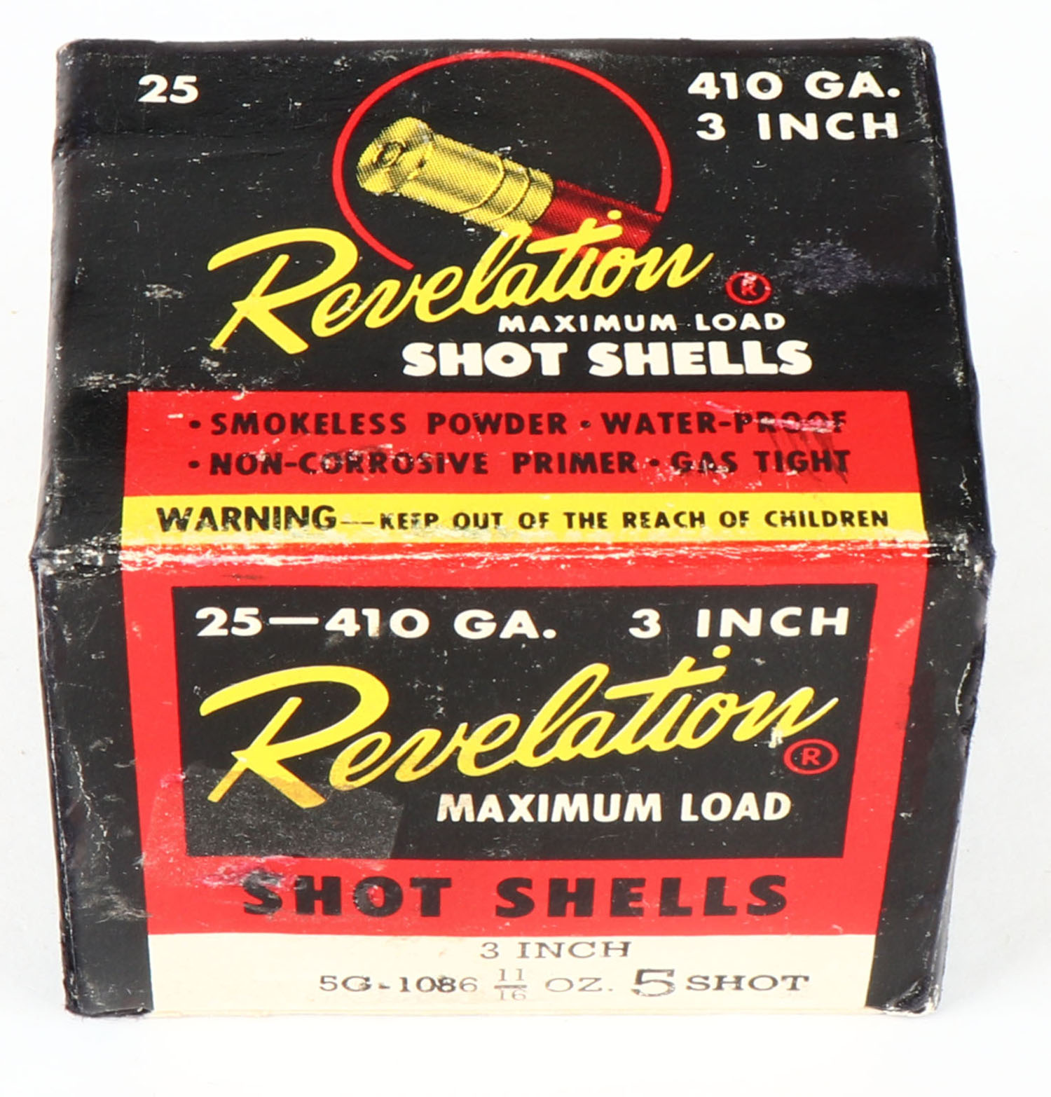 Revelation, 410ga., 3'', 1pc., Full, shot size 5, multi-colored box, box is solid with very nice colors, plastic shells are excellent. Grade: Very Good - Value: 20 to 60