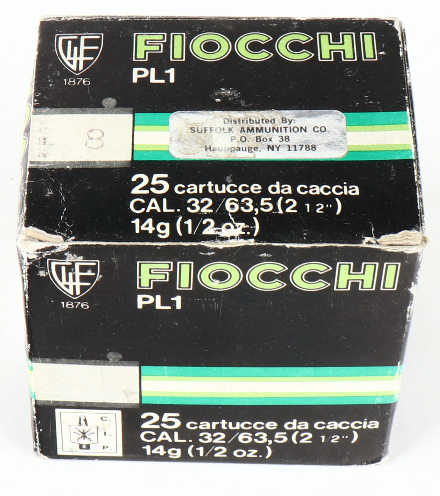 Fiocchi, 32ga., 1pc., Full, 2 1/2'', shot size 8, multi-colored box, box has light age soiling with some edge wear, plastic shells are very good. Grade: Very Good + - Value: 20 to 60
