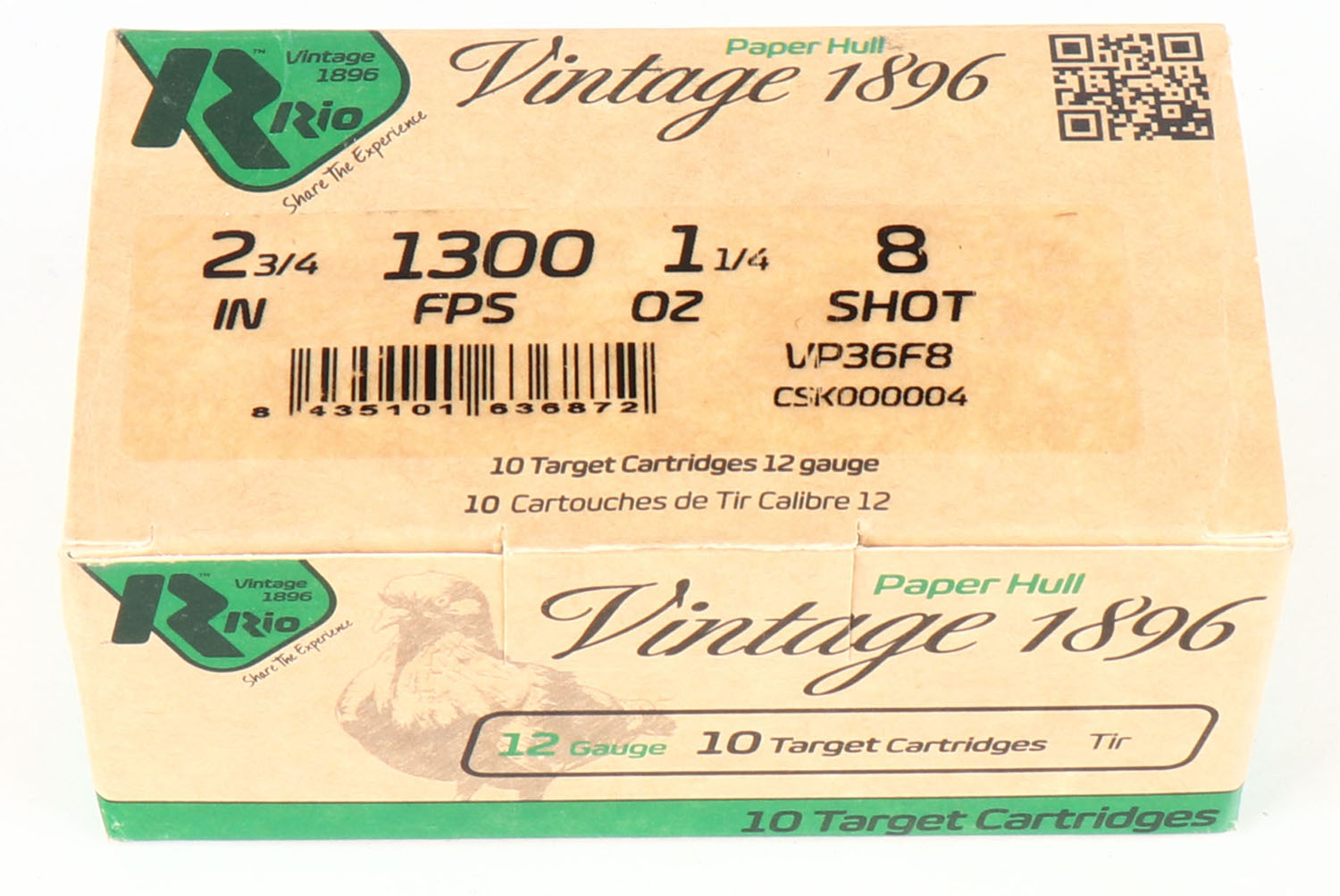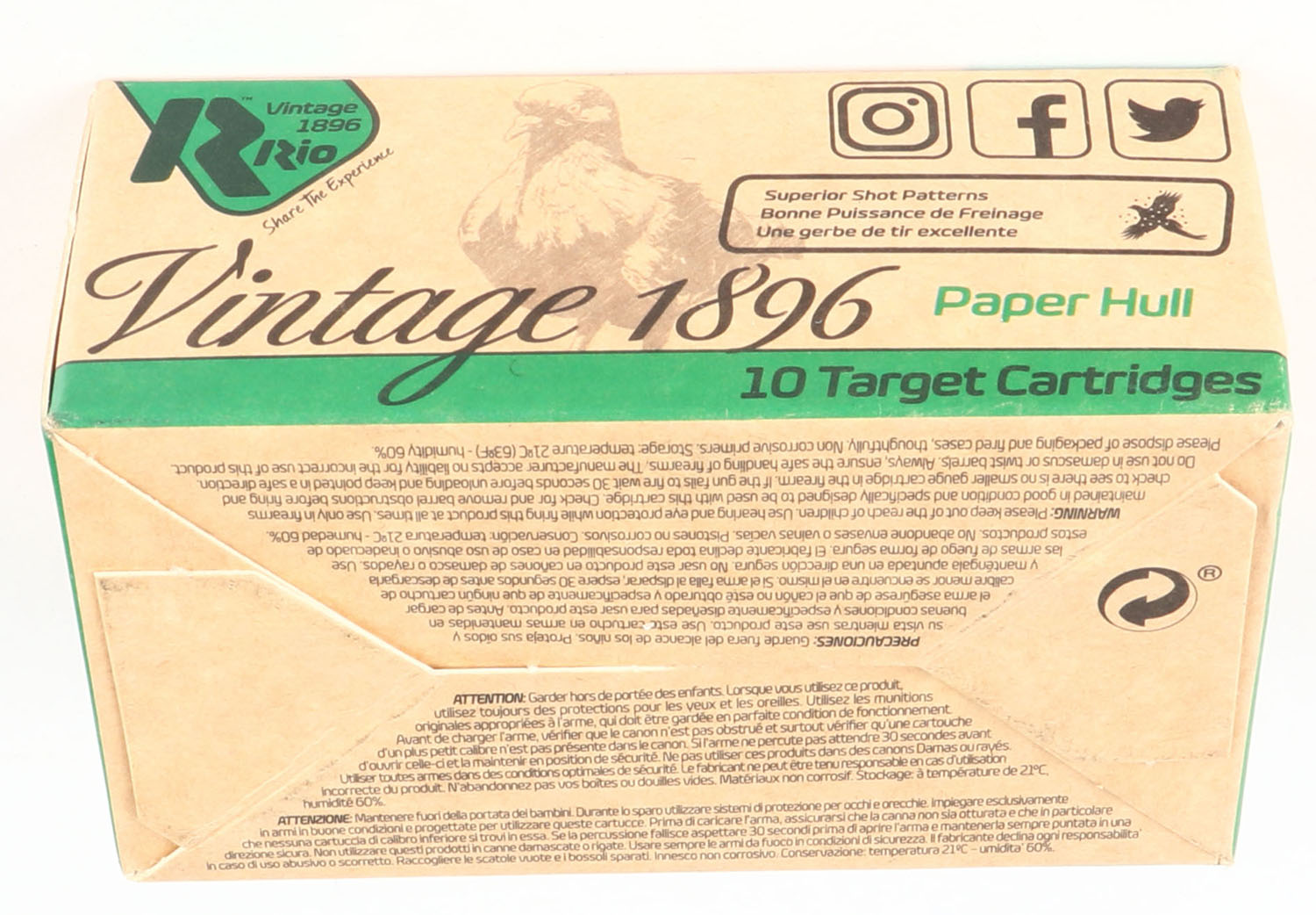Rio, Vintage 1896, 12ga., 1pc., Full, shot size 8, box is very solid with excellent colors, paper shells are minty. Grade: Excellent ++ - Value: 10 to 40