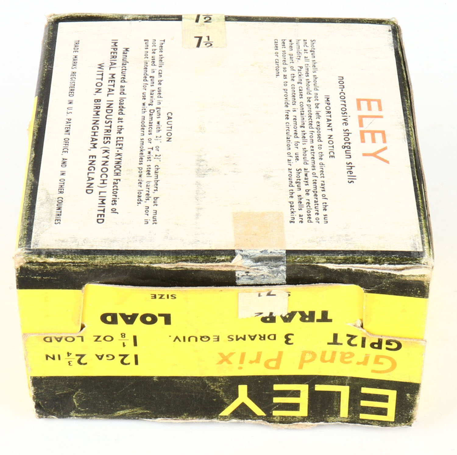 Eley, Grand Prix, Trap Load, 12ga., 1pc., Full, shot size 7 1/2, multi-color box, box has some age soiling with scuffing, paper shells are excellent. Grade: Very Good ++ - Value: 10 to 40
