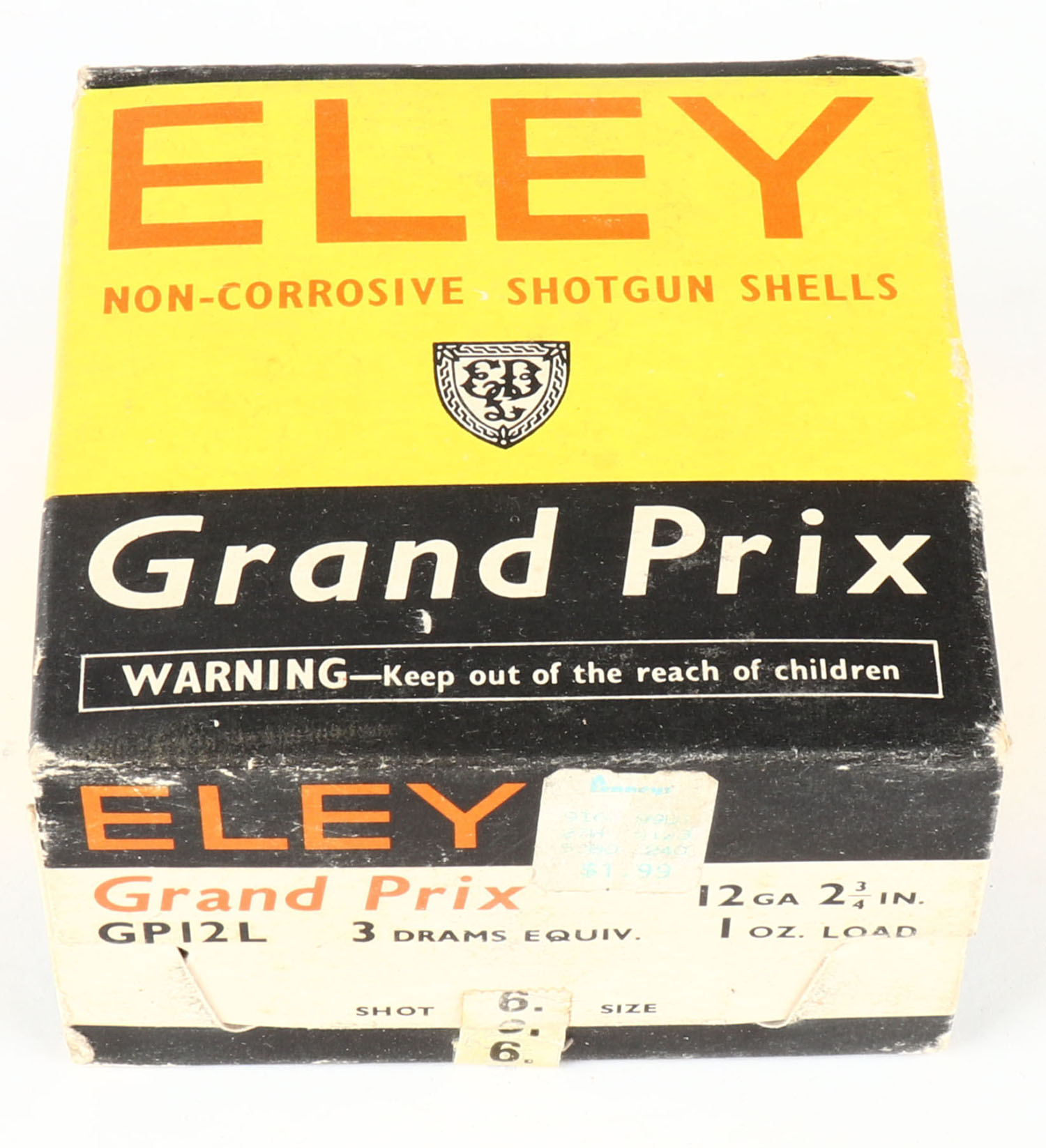 Eley, Grand Prix, 12ga., 1pc., Full, shot size 6, multi-color box, box is solid with scuffing, paper shells are excellent. Grade: Very Good ++ - Value: 10 to 40