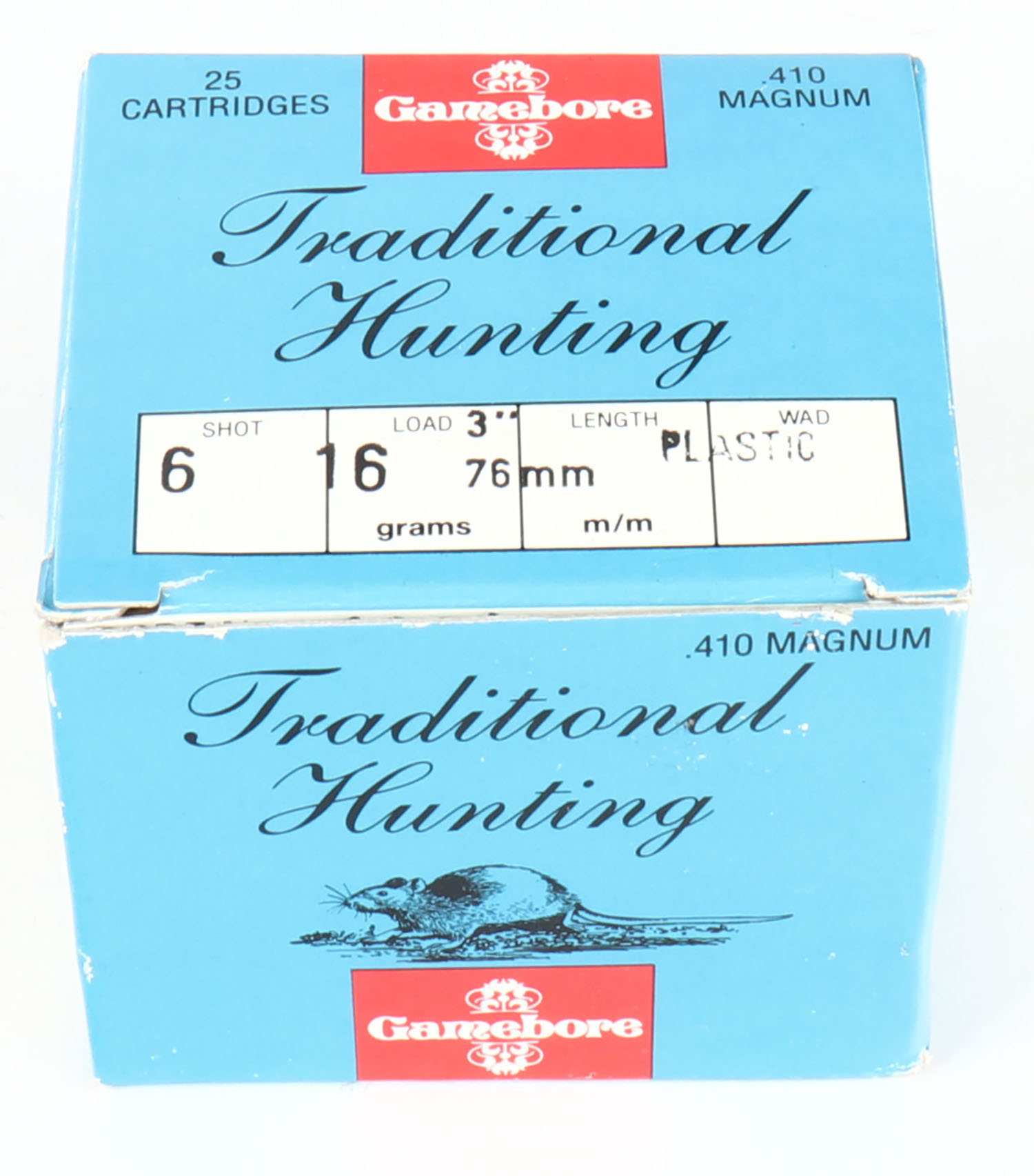 Gamebore, Traditional Hunting, 410ga. Magnum, 1pc., Full, shot size 6, multi-colored box, box is very solid with excellent colors, plastic shells are minty. Grade: MINT - Value: 10 to 60