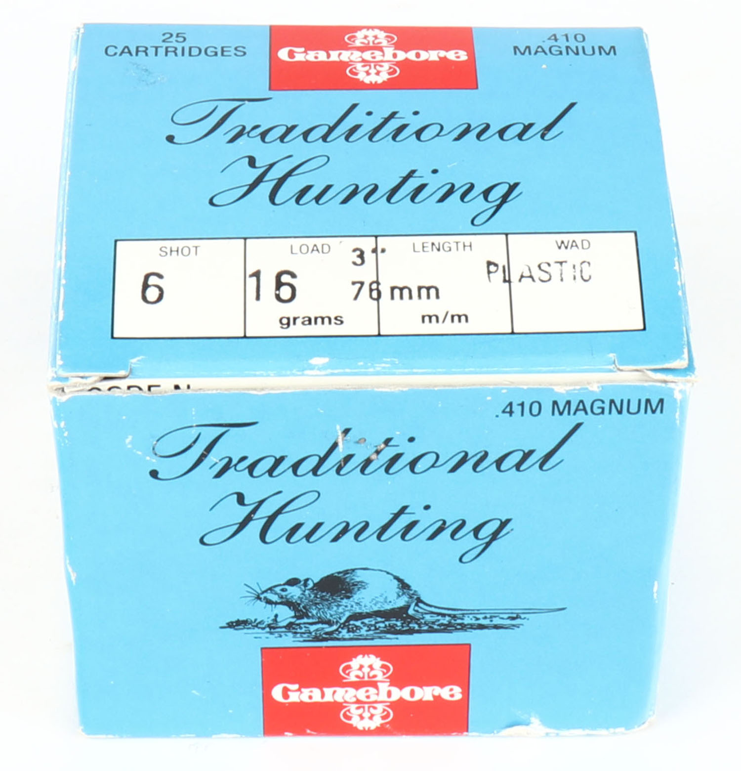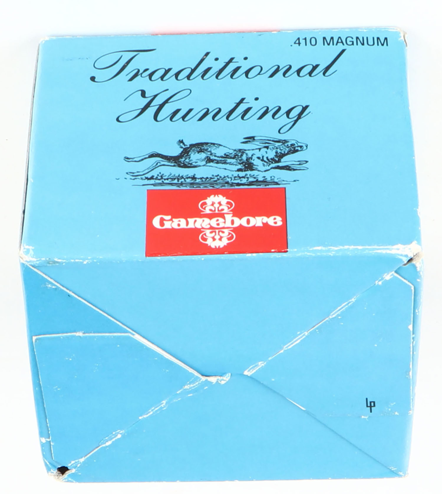 Gamebore, Traditional Hunting, 410ga. Magnum, 1pc., Full, shot size 6, multi-colored box, box is solid with some edge wear, plastic shells are minty. Grade: Excellent - Value: 10 to 60