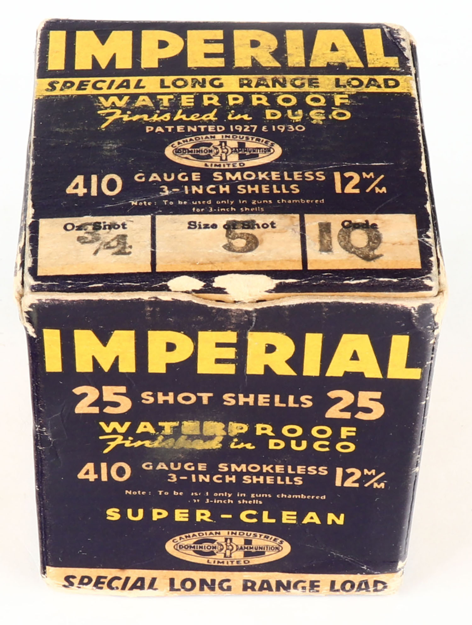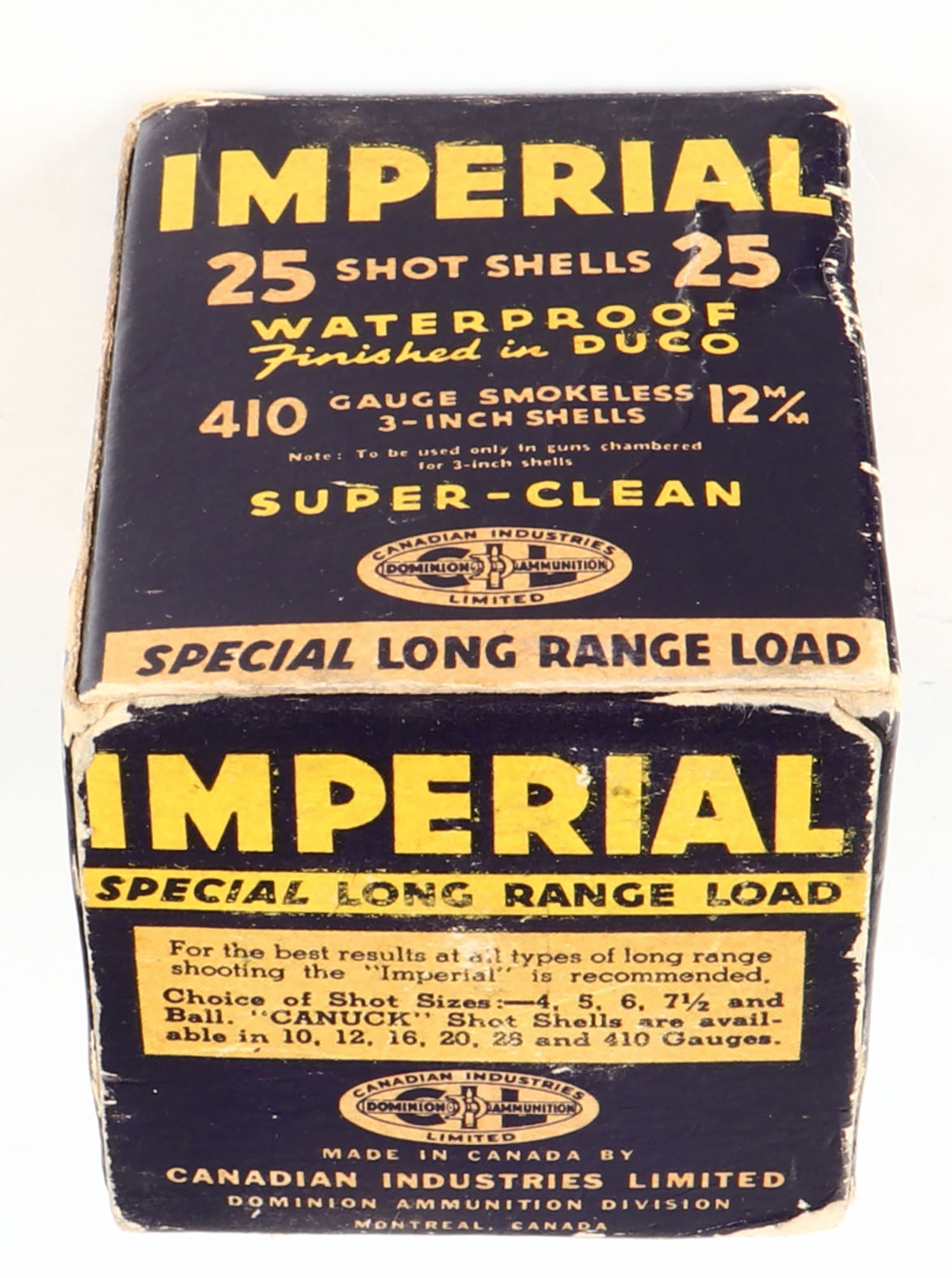 CIL, Imperial, Special Long Range Load, 410ga., 1pc., Partial 22rds., shot size 5, multi-colored box, box has some age soiling with edge wear, paper shells are excellent. Grade: Very Good + - Value: 20 to 60