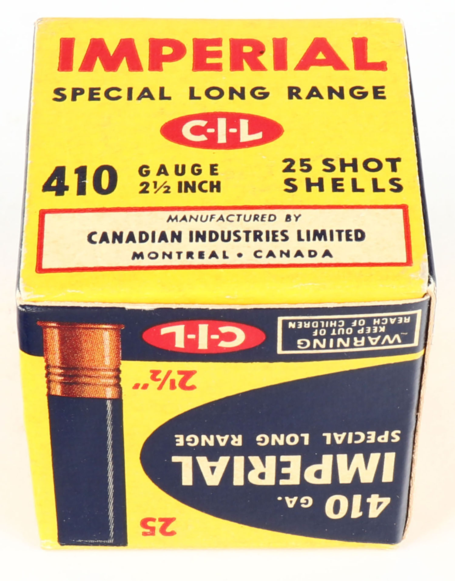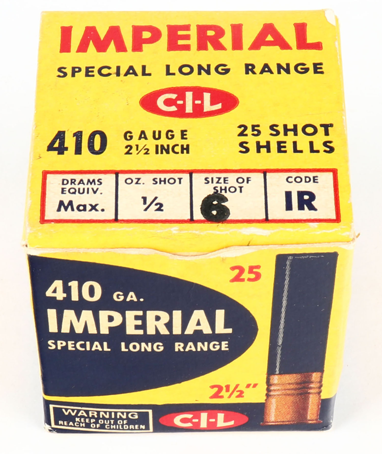 CIL, Imperial, 410ga., 1pc., Partial 16 rds., 2 1/2'', shot size 6, multi-colored box, box is very solid with excellent colors, paper shells are minty. Grade: Excellent - Value: 8 to 30