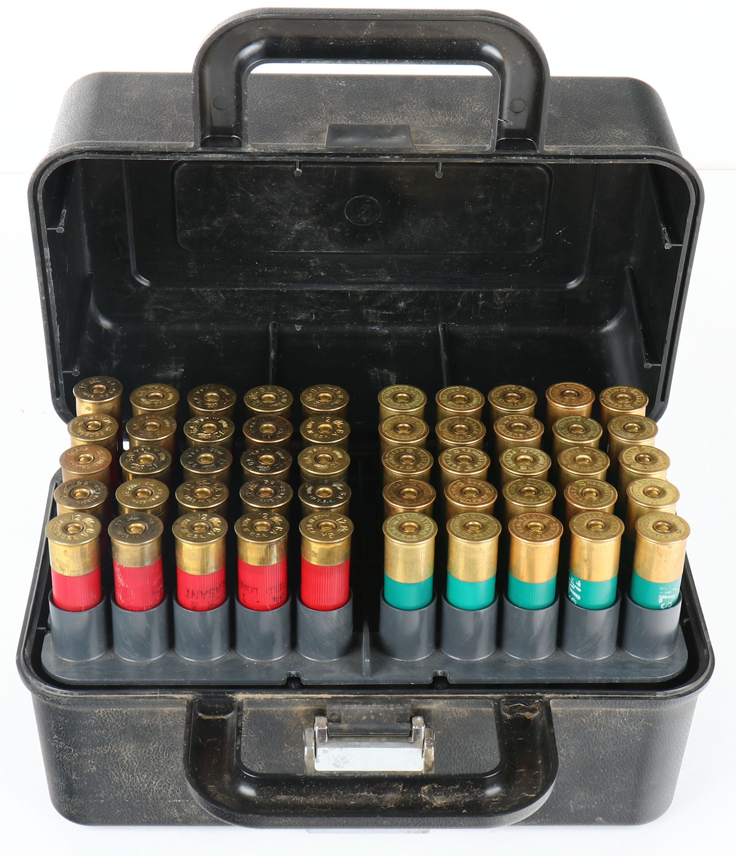 Mixed Shotshells, 12ga., 1pc., Full 100rds., mixed shot sizes, black plastic case is solid, plastic shells are very good. Grade: Very Good - Value: 10 to 60