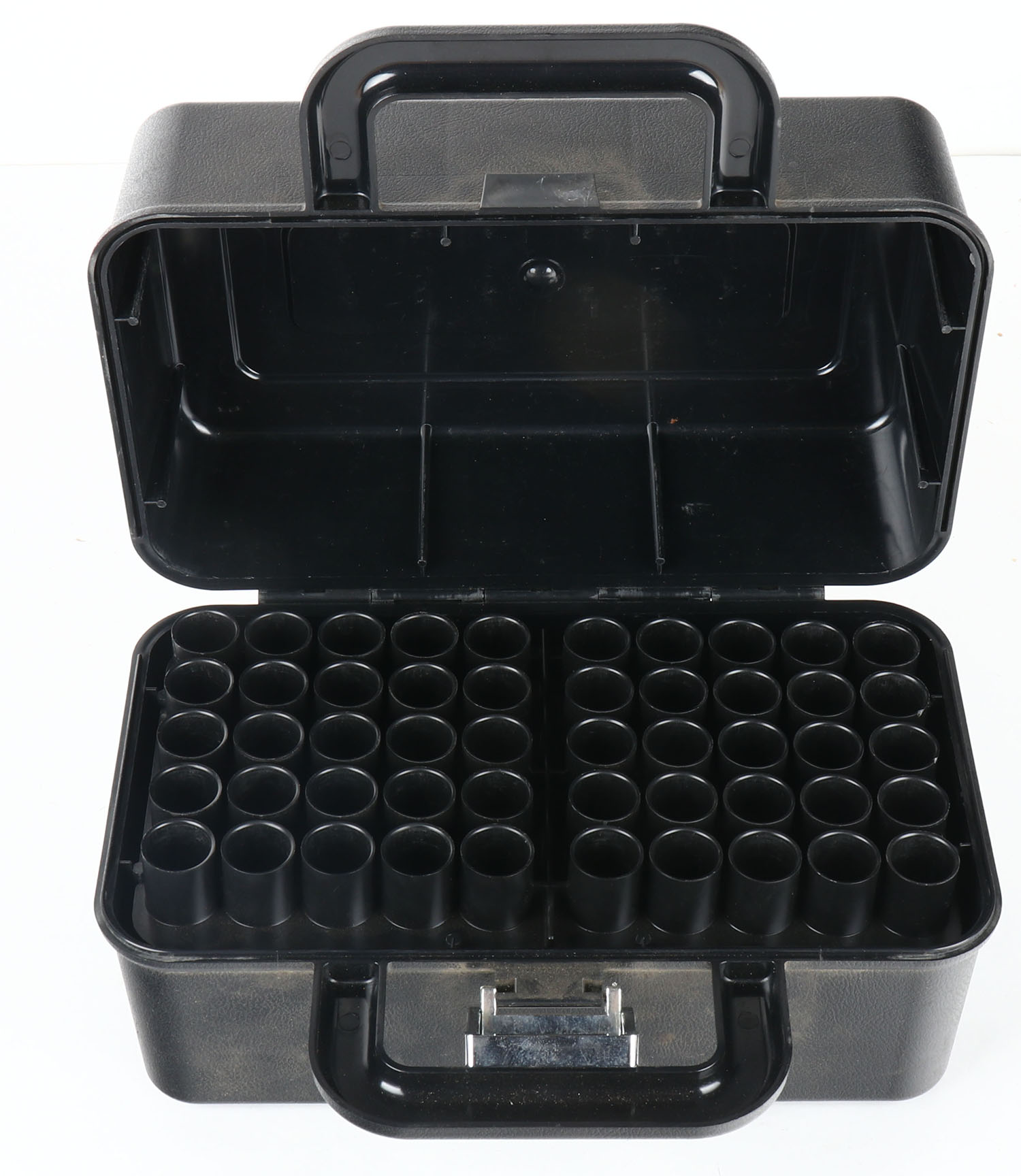 Mixed Shotshells, 12ga., 1pc., Partial 50rds., mixed shot sizes, black plastic case is solid, case fits 200rds. Of shotshells, plastic shells are fair. Grade: Good - Value: 8 to 40
