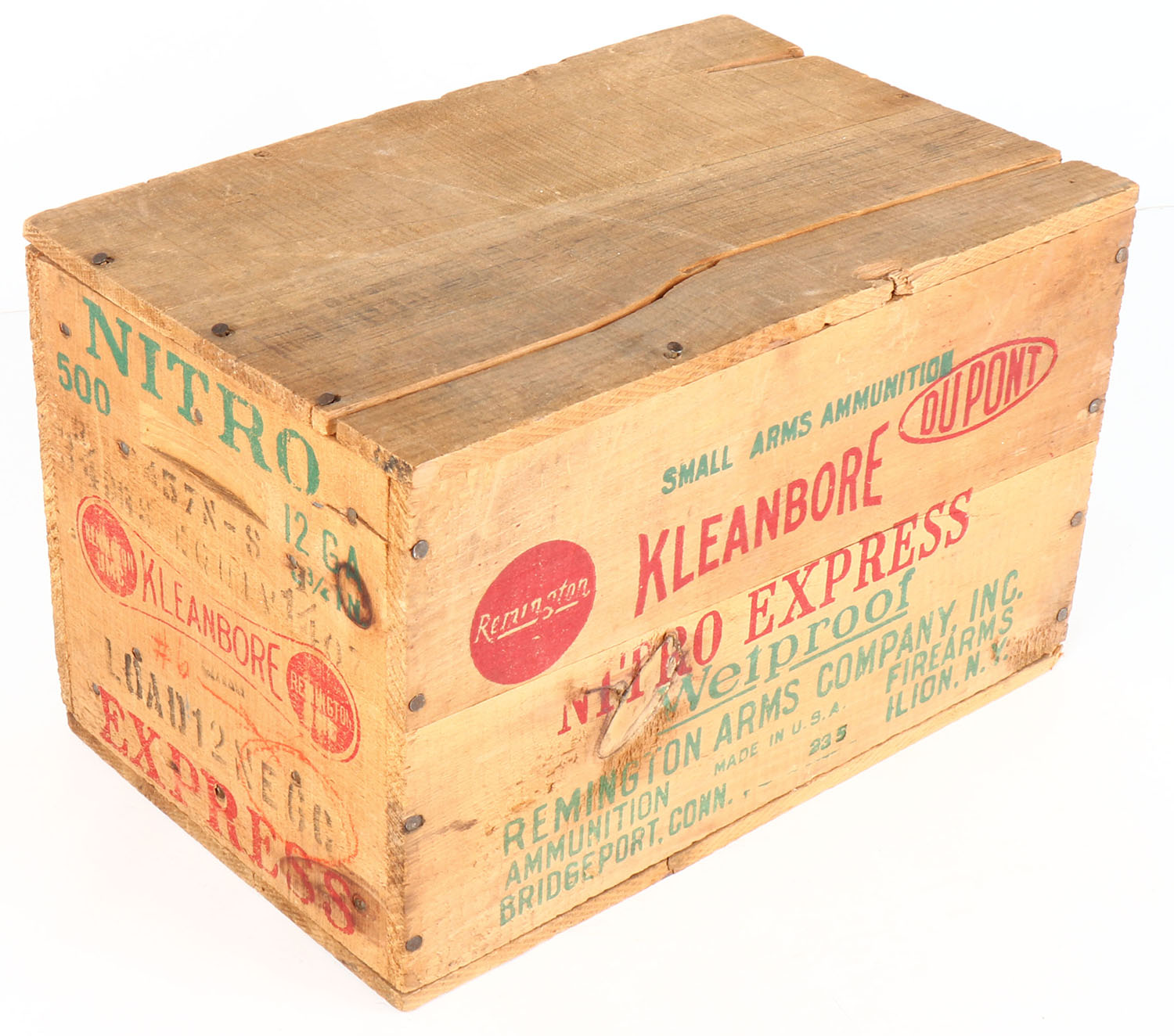 Full Wood Case of Remington, Kleanbore Nitro Express, 12ga., 1pc., Full 20 boxes, shot size 6C, Loading: 3 3/4 Drs., 1 1/4 Oz., 2 3/4'', wood case has original lid and is very solid, boxes are mint. Grade: MINT - Value: 500 to 1000