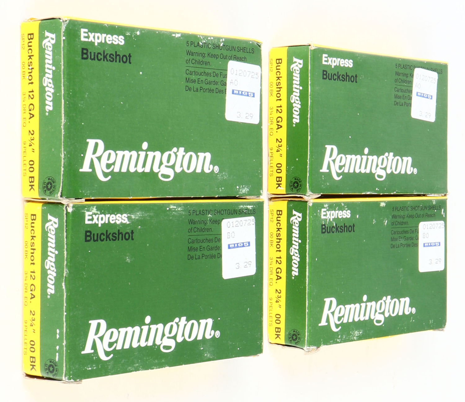 Lot of 4 Remington, Express Buckshot, 12ga., 1pc., Appears Full, shot size 00 Buck, multi-colored boxes. Grade: Excellent - Value: 30 to 60