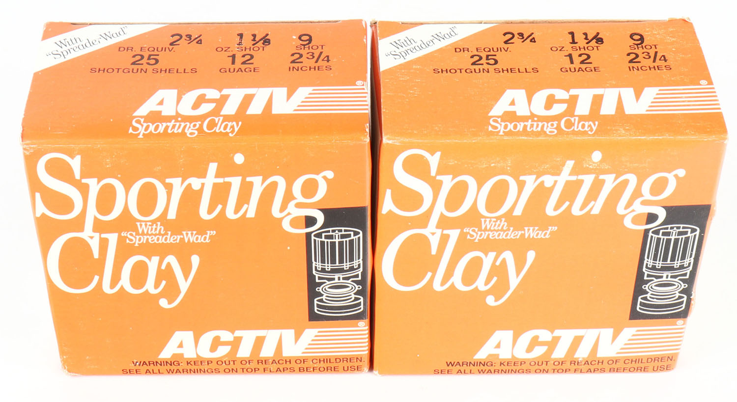 Lot of 2 ACTIV, 12ga., 1pc., Appears Full, shot size 9, multi-colored boxes. Grade: Excellent ++ - Value: 10 to 40