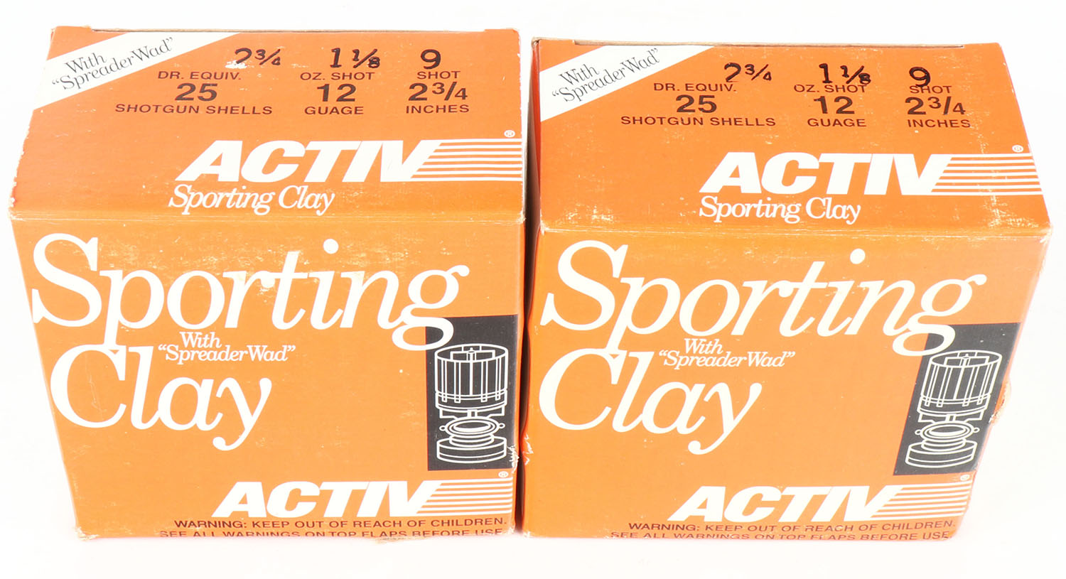 Lot of 2 ACTIV, 12ga., 1pc., Appears Full, shot size 9, multi-colored boxes. Grade: Excellent + - Value: 10 to 40