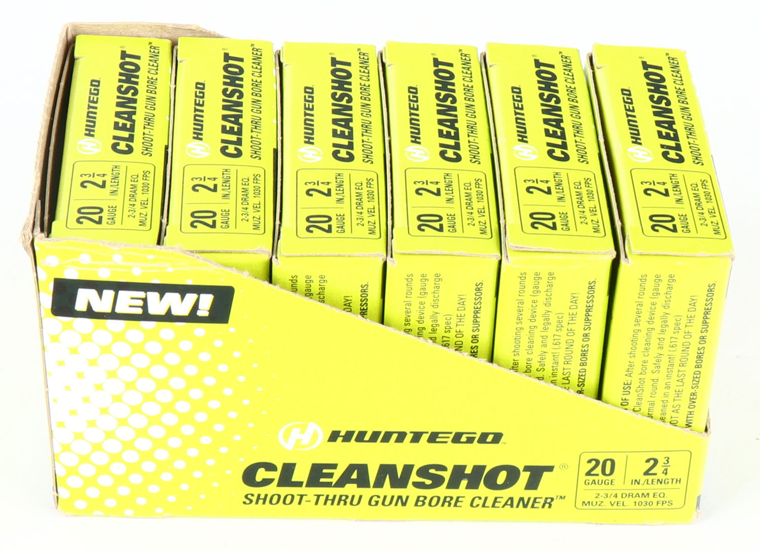 Lot of 6 Huntego Cleanshot, 20ga., 1pc., Full Tray, Shot-Thru Gun Bore Cleaner, multi-colored boxes. Grade: Excellent + - Value: 10 to 40