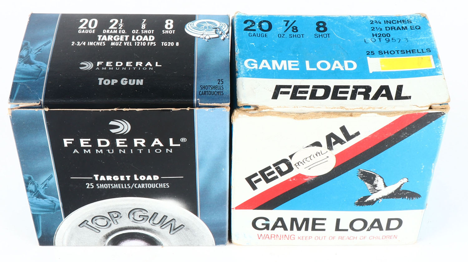 Lot of 2, Mixed Manufacture, 20ga., Appears Full, shot size 8, Shotshell boxes. Grade: Very Good - Value: 10 to 30