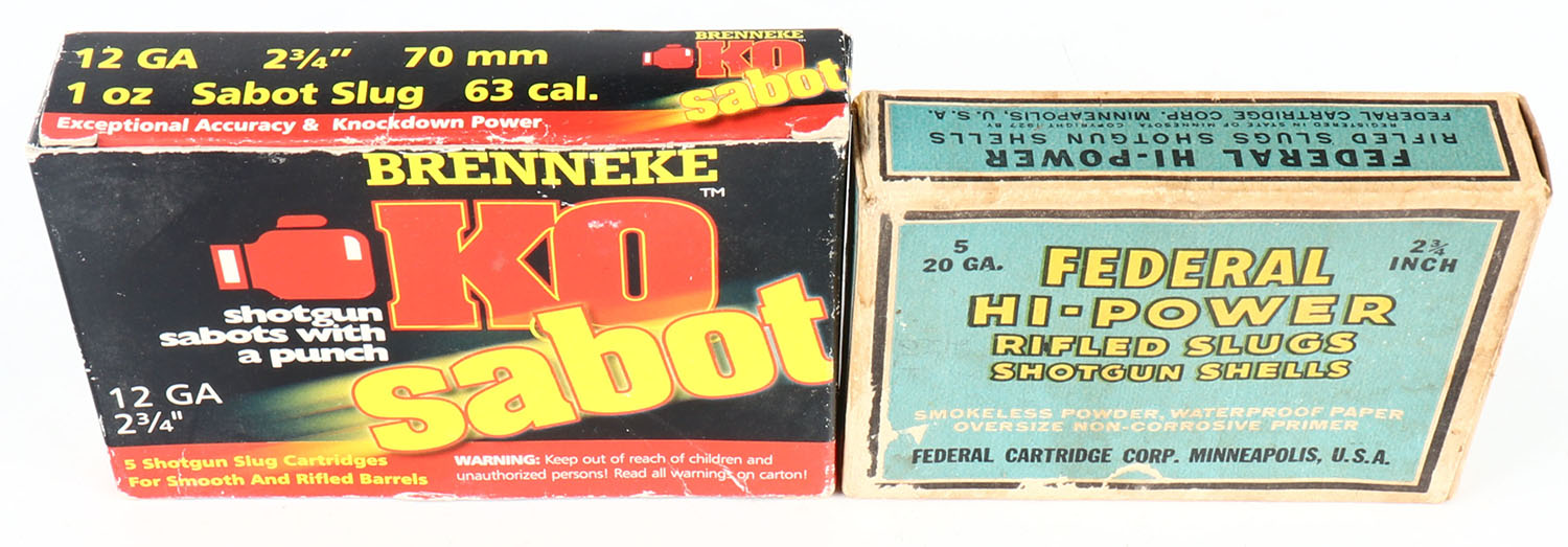 Lot of 2, Mixed Manufacture, 12 & 20ga., Appears Full, shot size Rifled Slug, shotshell boxes. Grade: Very Good - Value: 8 to 20