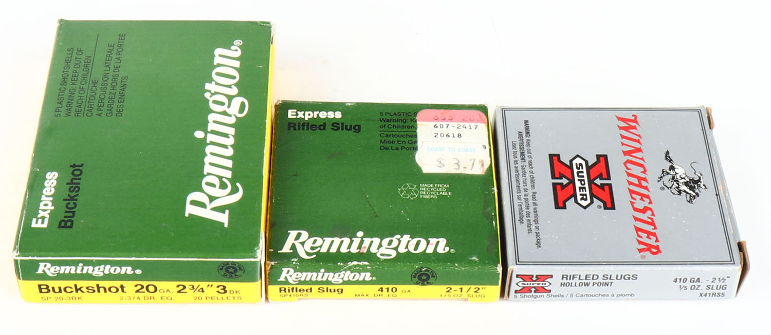 Lot of 3, Mixed Manufacture, 20 & 410ga., Appears Full, shot size 3 Buck & Rifled Slug, Shotshell boxes. Grade: Very Good - Value: 8 to 20