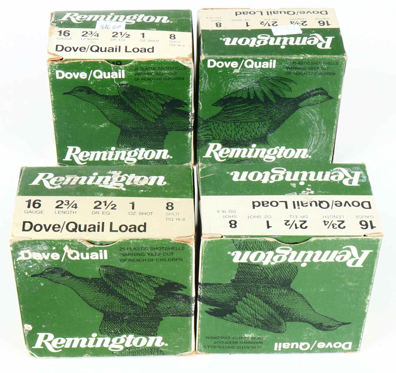 Lot of 4 Remington, Dove/Quail Load, 16ga., 1pc., shot size 8, Appears Full, multi-colored boxes. Grade: Very Good + - Value: 10 to 40