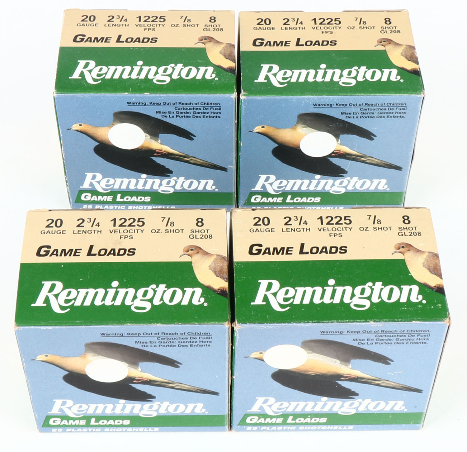Lot of 4 Remington, 20ga., 1pc., shot size 8, Appears Full, multi-colored boxes. Grade: Excellent + - Value: 10 to 40