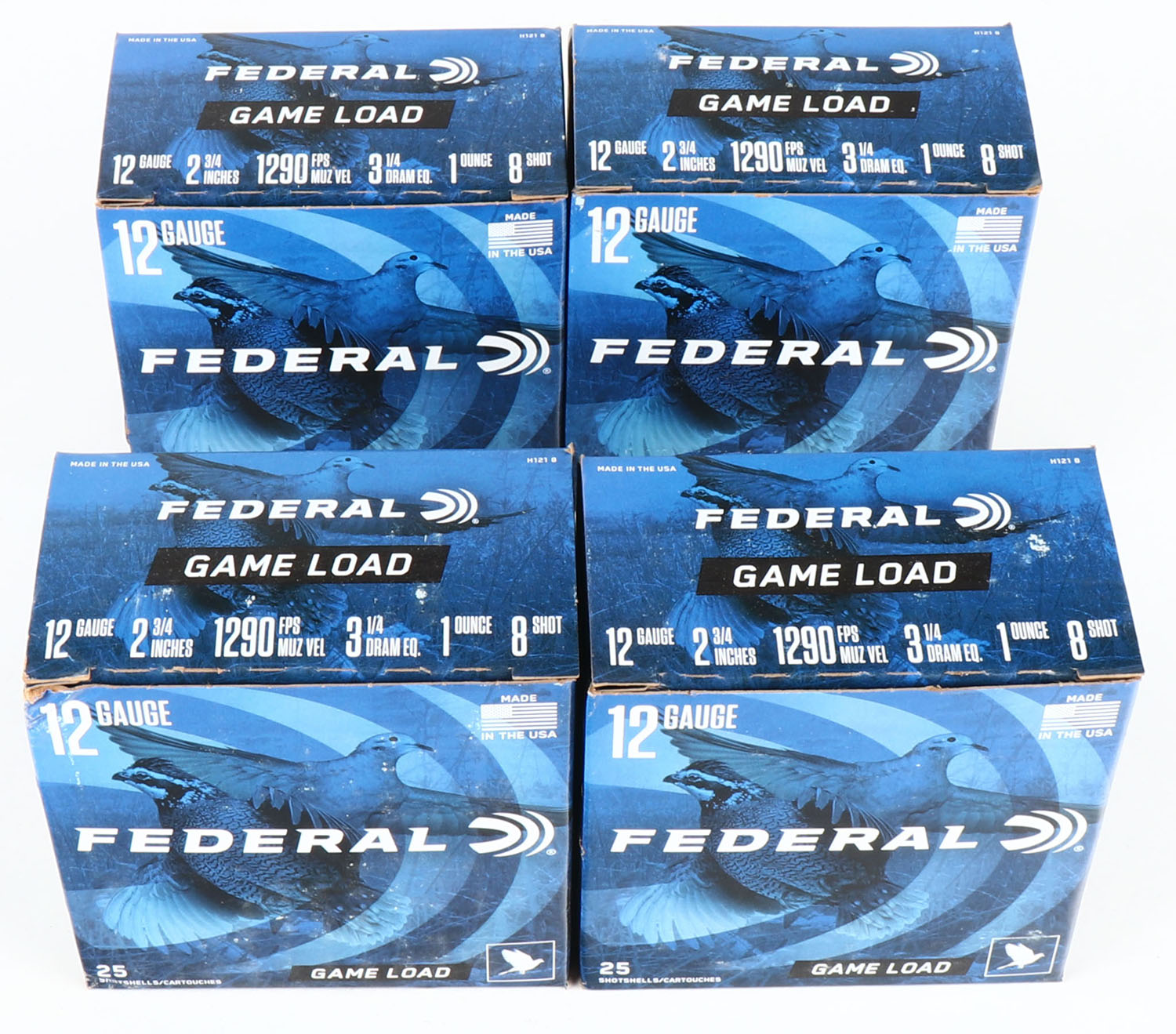 Lot of 4 Federal, 12ga., shot size 8, Appears Full, Shotshell boxes. Grade: Excellent + - Value: 10 to 40