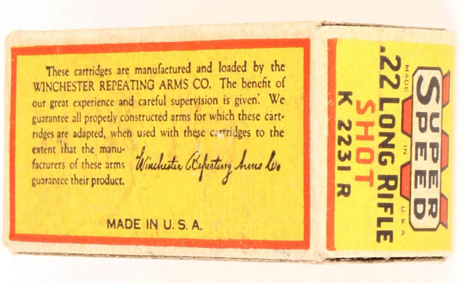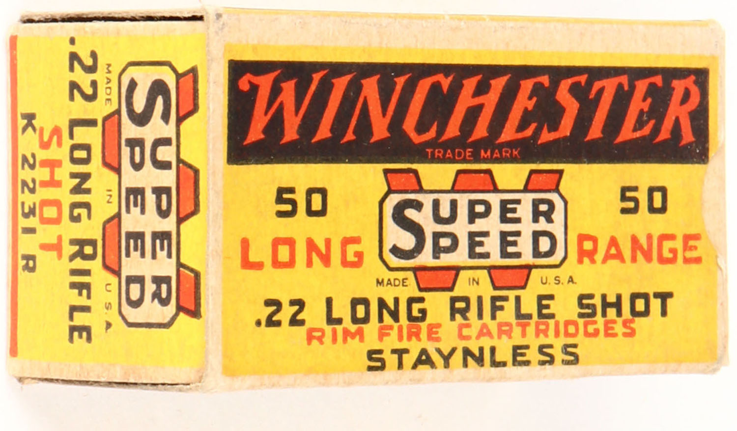 Winchester, Super Speed, .22 Long Rifle Shot, Staynless, RHWeb: WRA-14A LR-4b, Full, 1pc. Yellow red & black box, box is solid with excellent color, minor age soiling, very minor corner wear, edges are crisp, end flaps are solid, ammo is excellent. Grade: Excellent - Value: 80 to 120