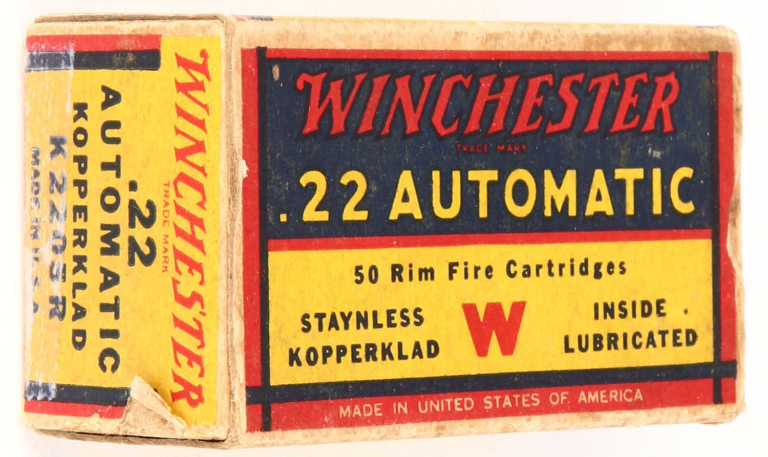 Winchester, Staynless Kopperklad, .22 Automatic, Inside Lubricated, RHWeb: WRA-15 WA-1b, Full, 1pc. Yellow blue & red box, both end flaps are torn & taped, excellent color, minor age soiling, minor edge & corner wear, end flaps are solid, ammo is excellent. Grade: Good ++ - Value: 40 to 60