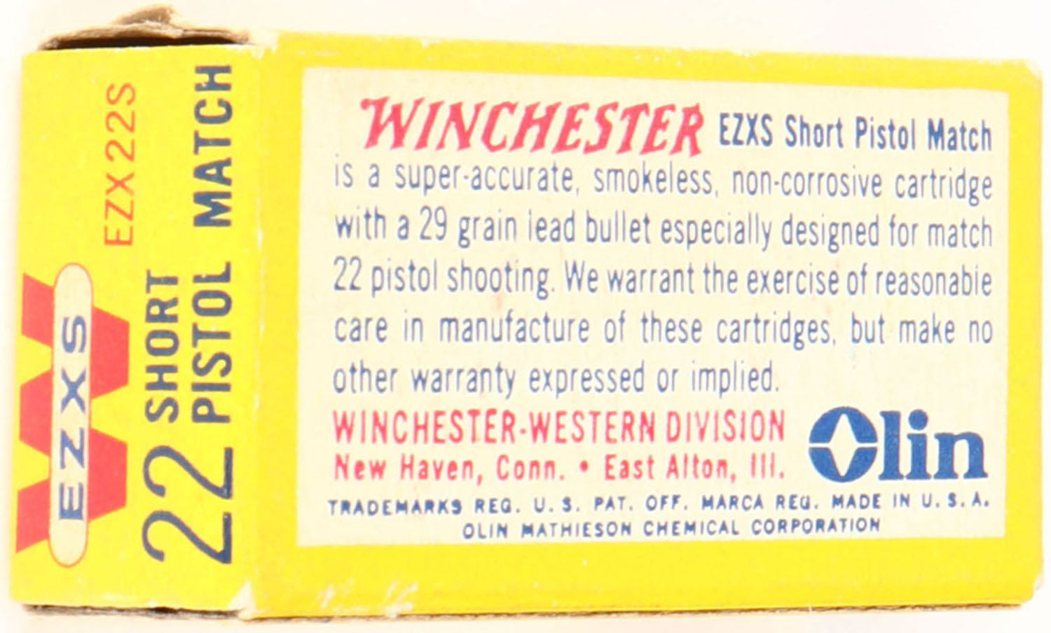 Winchester, EZXS, .22 Short, Pistol Match, RHWeb: WRA-54 S-1, Full, 1pc. Yellow red & white box, box is solid with excellent color, very minor shelf & corner wear, edges are mostly crisp, end flaps are solid, ammo is minty. Grade: Excellent + - Value: 70 to 120