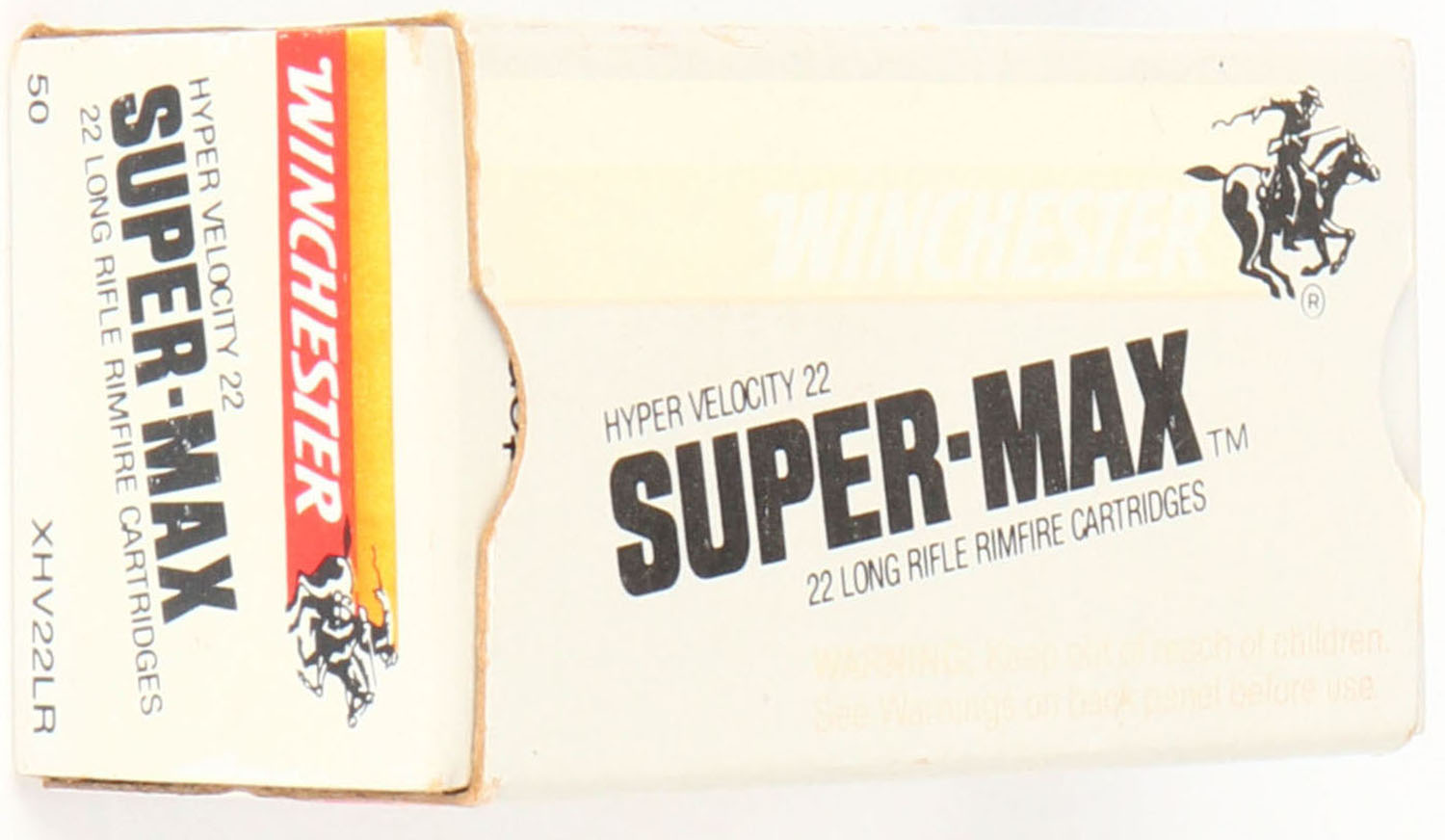 Winchester, Super-Max, .22 Long Rifle Hollow Point, Hyper Velocity, RHWeb: WRA-H&R-1C LR-8, Full, 1pc. Gray red & black box, box is solid with fair color, significant color fading to top, corners are mostly sharp, edges are crisp, end flaps are solid, ammo is minty. Grade: Very Good + - Value: 6 to 12