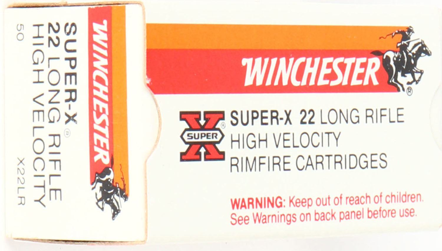 Winchester, Super-X, .22 Long Rifle, High Velocity, RHWeb: WRA-H&R-1D LR-1, Full, 1pc. White red & orange box, box is MINT with minty color, corners are sharp, edges are crisp, end flaps are solid, ammo is minty. Grade: MINT - Value: 6 to 12