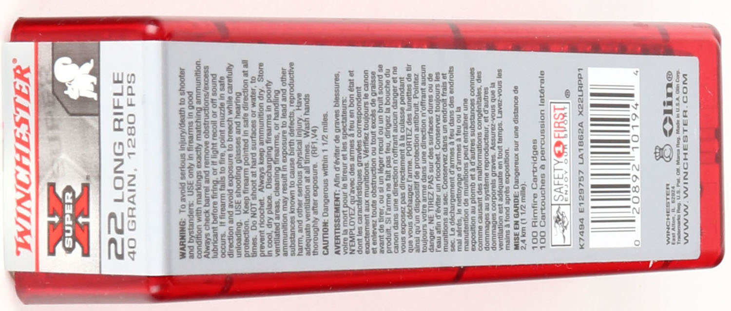 Winchester, Super X, .22 Long Rifle, 40 Grain Power-Point Copper Plated, 1280 FPS, not in RHWeb, 2pc. Red plastic tray with silver sealing label, box and label are MINT with minty color, ammo appears mint. Grade: MINT - Value: 10 to 20