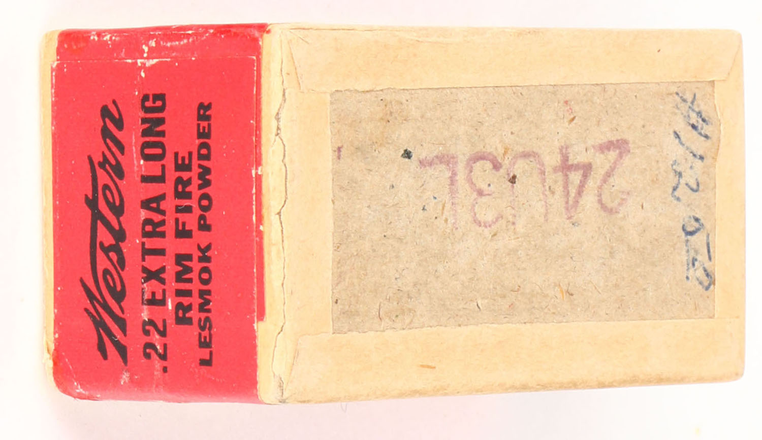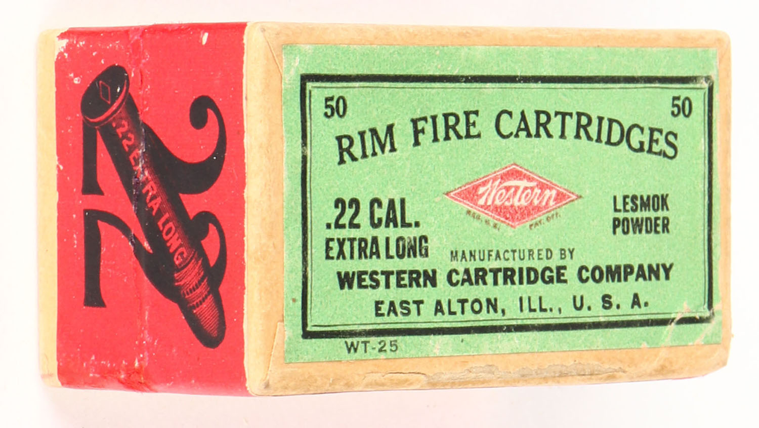 Western, Rim Fire Cartridges, .22 Extra Long, Lesmok Powder, RHWeb: WCC-3 XL-1, FULL & SEALED, 2pc. Buff box with green top & red side sealing labels, box is solid with excellent color, minor edge wear, very minor corner wear, labels are intact. Grade: Excellent + - Value: 180 to 240