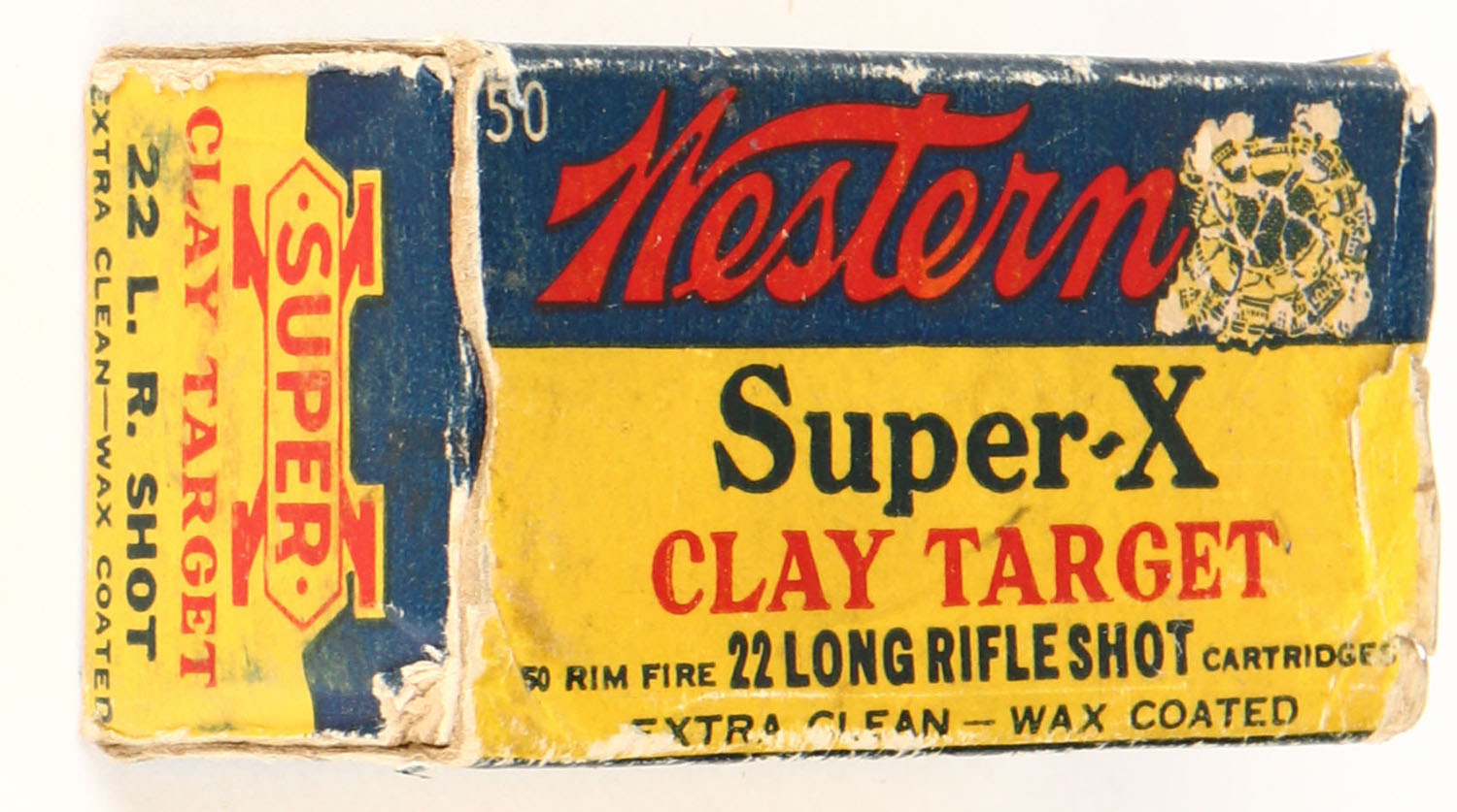 Western, Super-X, .22 Long Rifle Shot, Extra Clean Wax Coated, RHWeb: WCC-Super-X-Long Rifle-49 LRS-10, Full, 1pc. Yellow blue & red box, box is solid with excellent color, minor age soiling, corner wear, tear on top, some edge wear, end flaps are solid, ammo is excellent. Grade: Very Good + - Value: 14 to 30