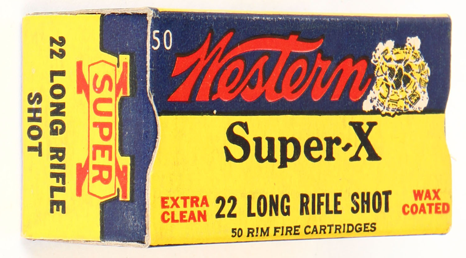Western, Super-X, .22 Long Rifle Shot, Extra Clean Wax Coated, RHWeb: WCC-Super-X-Long Rifle-49 LRS-10, Full, 1pc. Yellow blue & red box, box is solid with excellent color, very minor corner wear, edges are crisp, end flaps are solid, ammo is excellent. Grade: Excellent ++ - Value: 24 to 36