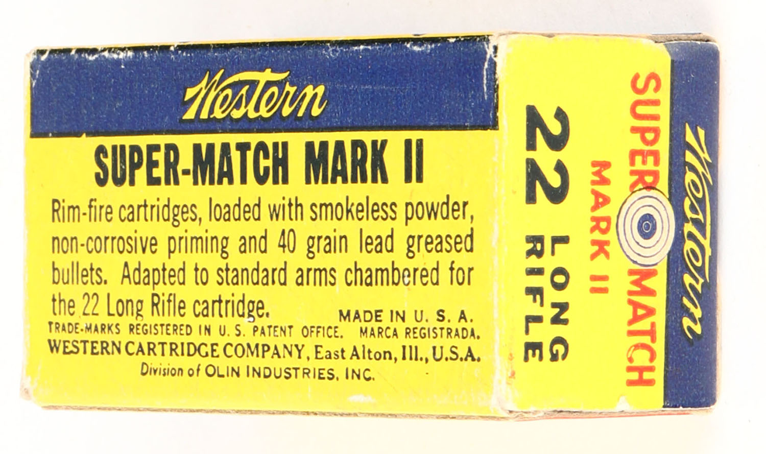 Western, Super Match Mark II, .22 Long Rifle, RHWeb: WCC-51.2 LR-3f, Full, 1pc. Yellow blue & red box, box is solid with excellent color, stain on top, scuff on bottom, minor edge & corner wear, end flaps are solid, ammo is very good. Grade: Very Good ++ - Value: 16 to 24