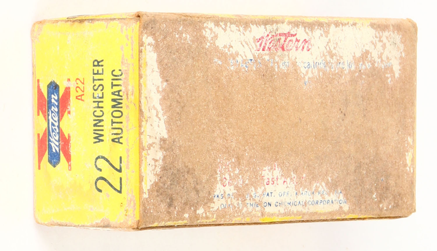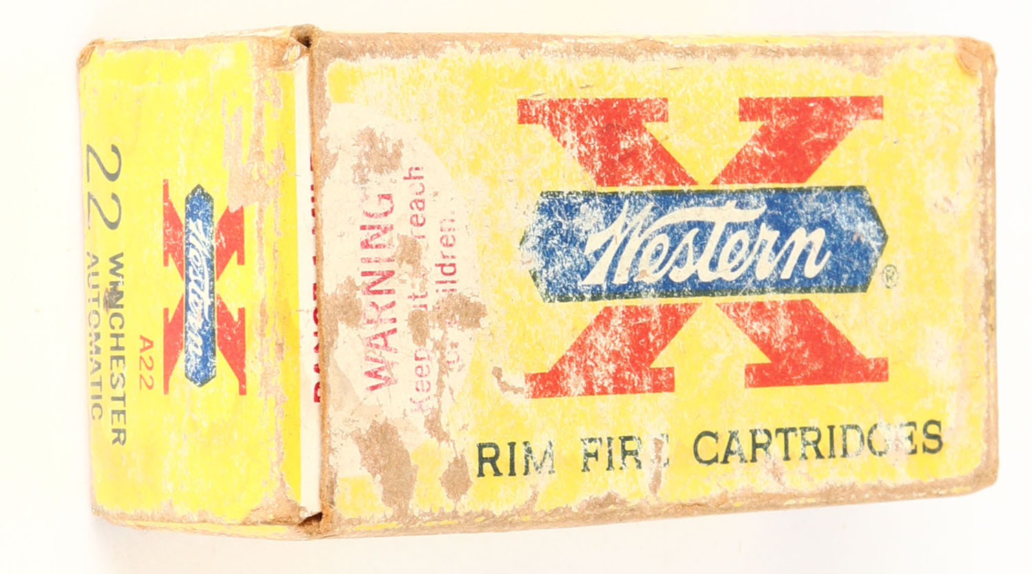 Western, X, .22 Winchester Automatic, 45 Gr. Lubaloy Coated Bullet, RHWeb: WCC-12 WA-1.5, Full, 1pc. Yellow red & white box, box is solid with good to very good color, shelf wear, minor color fading, some edge & corner wear, end flaps are solid, ammo is excellent. Grade: Very Good - Value: 18 to 30